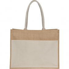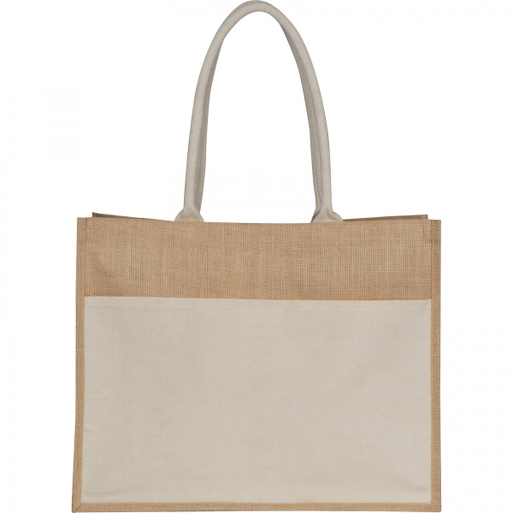 Torba z certyfikatem Oeko-Tex® STANDARD 100, wykonana z juty, z bawełnianą wstawką z przodu torby umożliwiającą znakowanie i wytrzymałymi długimi uchwytami.