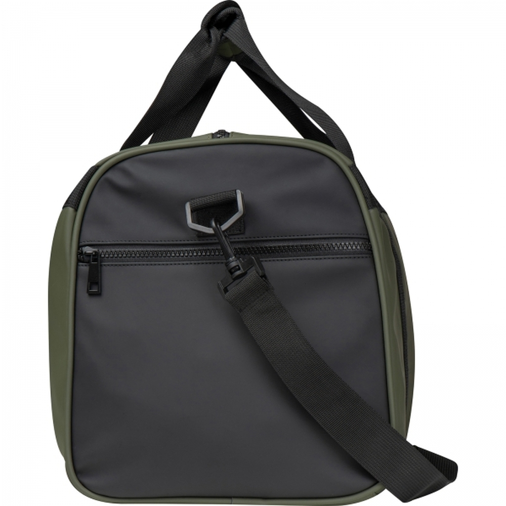 Duża torba podróżna wykonana z wodoodpornego PU z dwoma dużymi kieszeniami.Materiały: PU 210T (matowa powłoka), nylon, pianka EVA (spód torby, uchwyt do rączek).