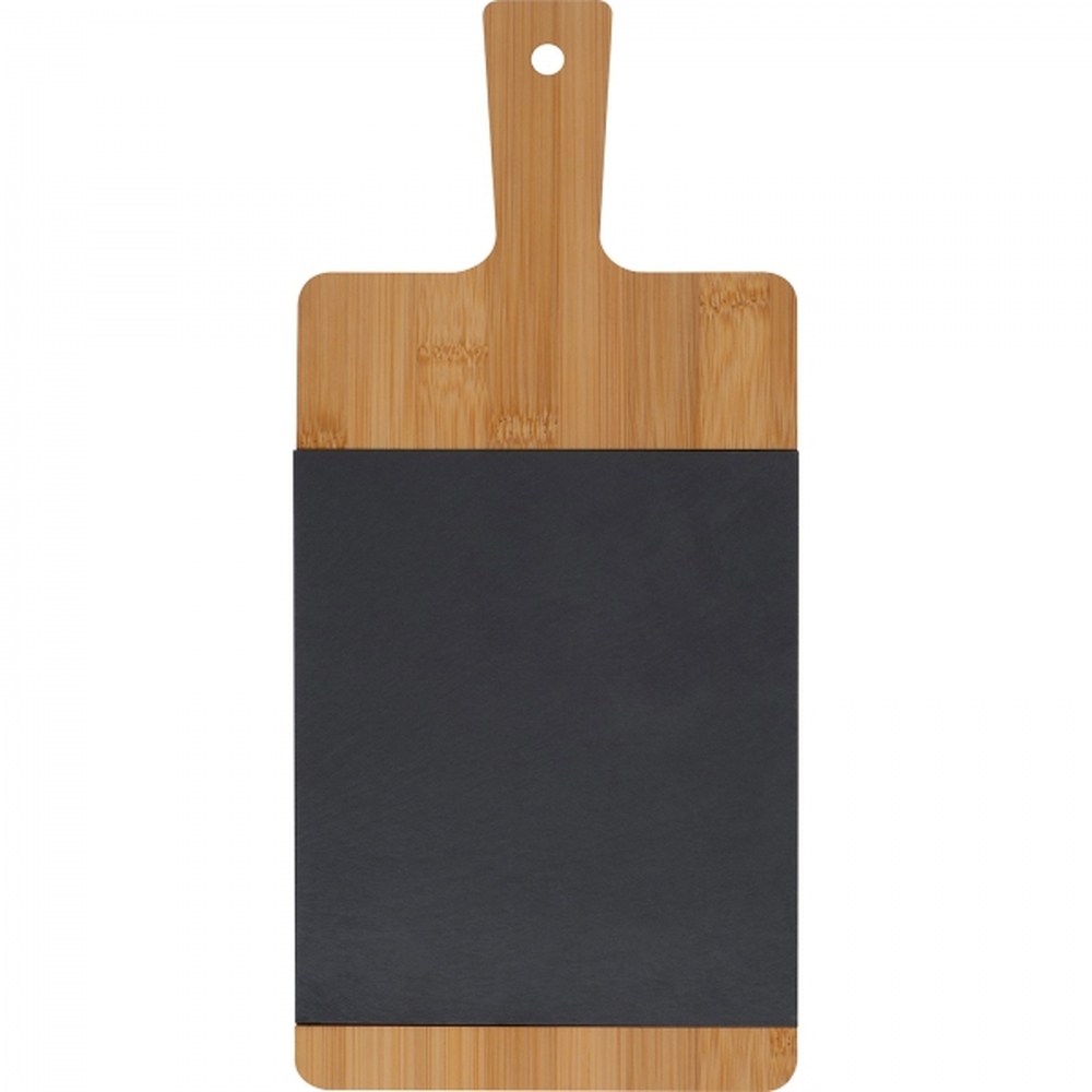 Deska kuchenna, do serwowania przekąsek, wykonana z drewna bambusowego z wkładką z łupka. Posiada rączkę do przenoszenia i oczko do zawieszenia na ścianie.