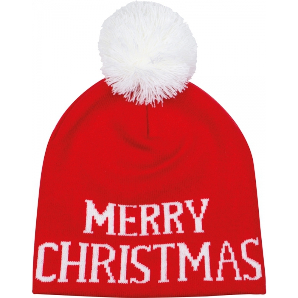 Akrylowa czapka ze świątecznym napisem i pomponem.