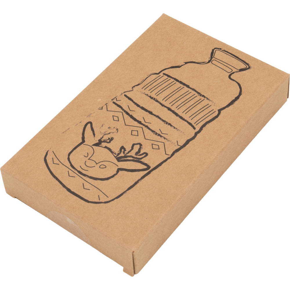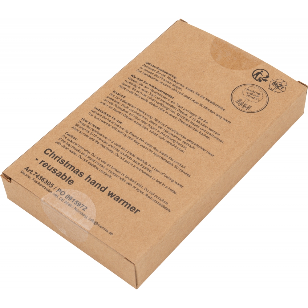 Mały ogrzewacz do rąk w pokrowcu z motywem świątecznym. Ogrzewacz aktywuje się poprzez zgięcie wewnętrznej metalowej płytki, co powoduje krystalizację płynu wewnątrz i wytwarzanie przyjemnego ciepła, czyniąc go idealnym towarzyszem na chłodne dni.
