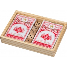 Dwie talie kart oraz zestaw kości do gry w drewnianym opakowaniu.