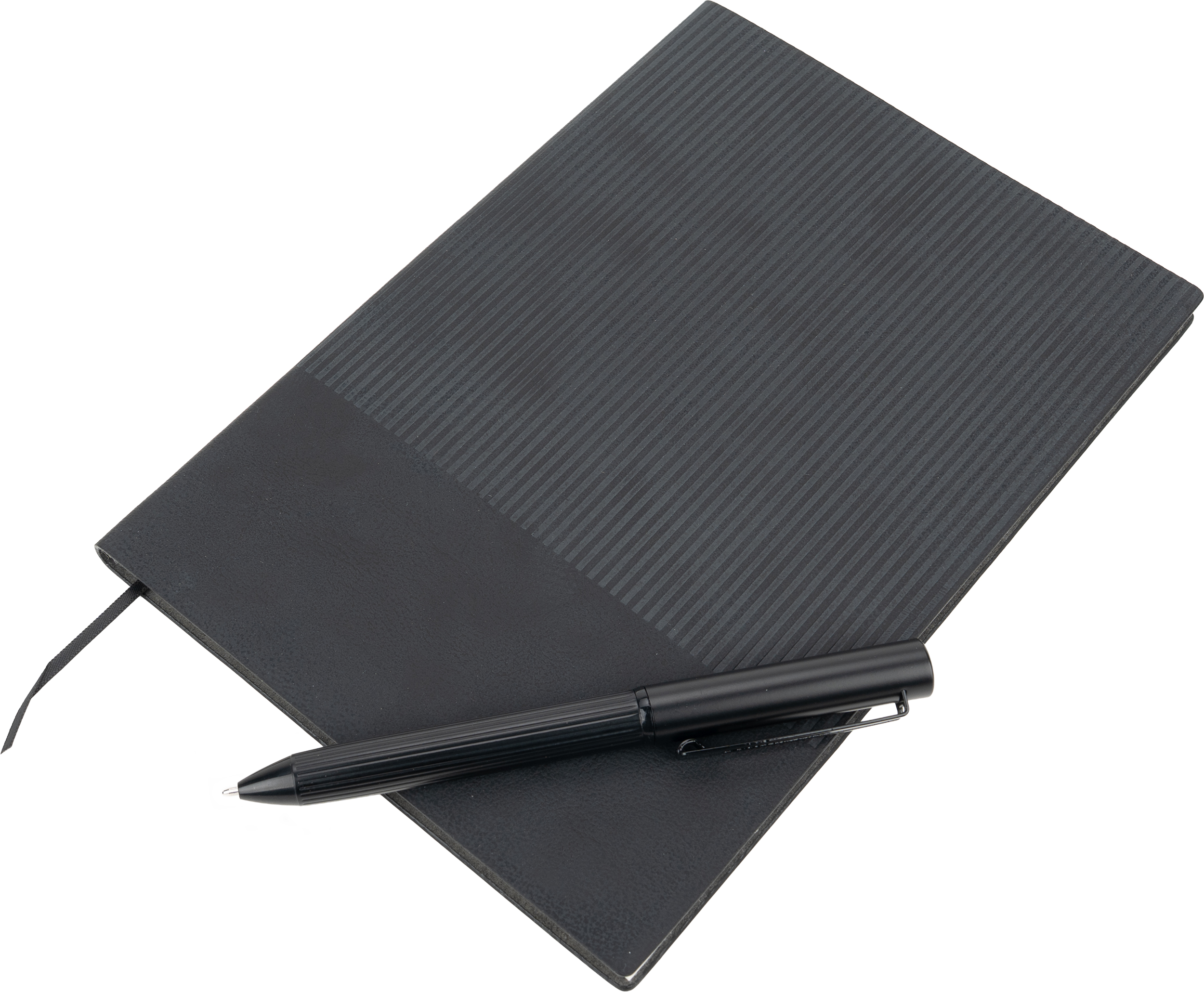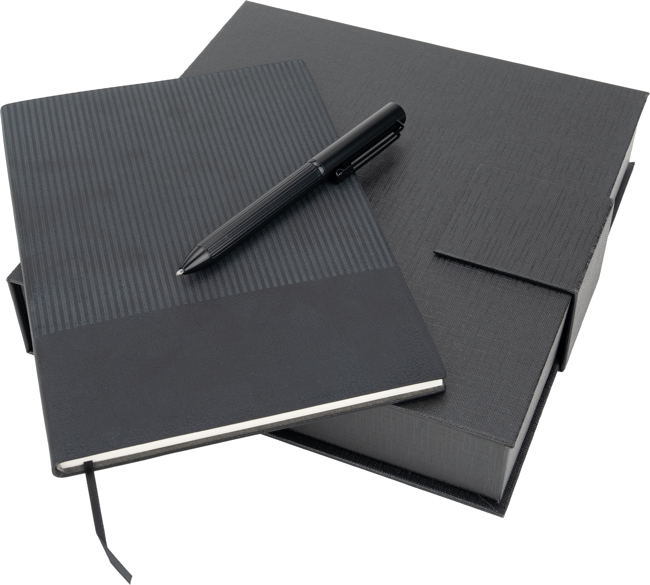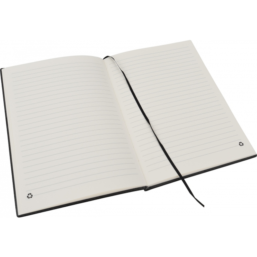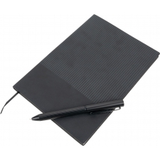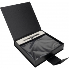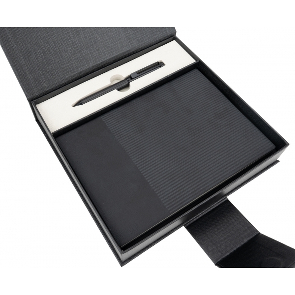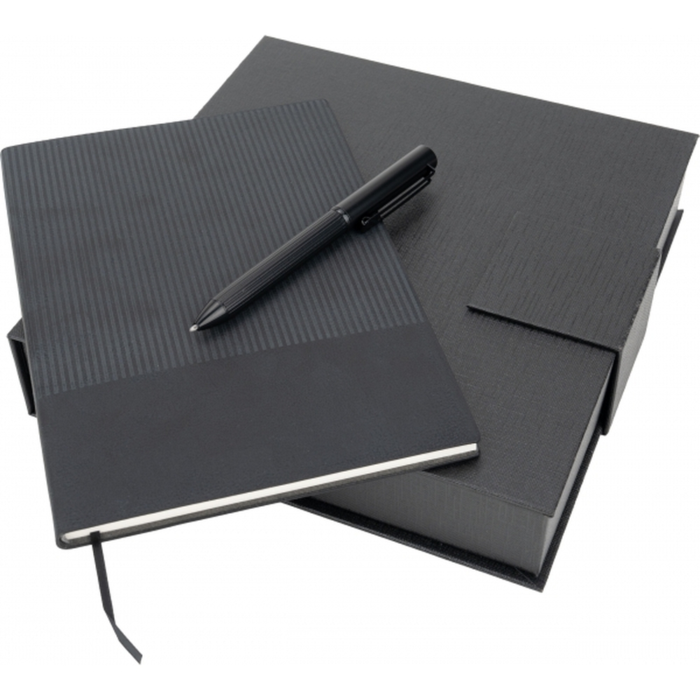 Zestaw składający się z piszącego na niebiesko, metalowego długopisu oraz z notesu w miękkiej okładce z 64 kartkami. Papier w notesie w linie wykonany z papieru pochodzącego z recyklingu. Całość zapakowana w ozdobne pudełko z magnetycznym zamknięciem.
