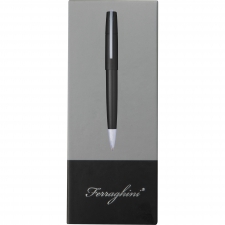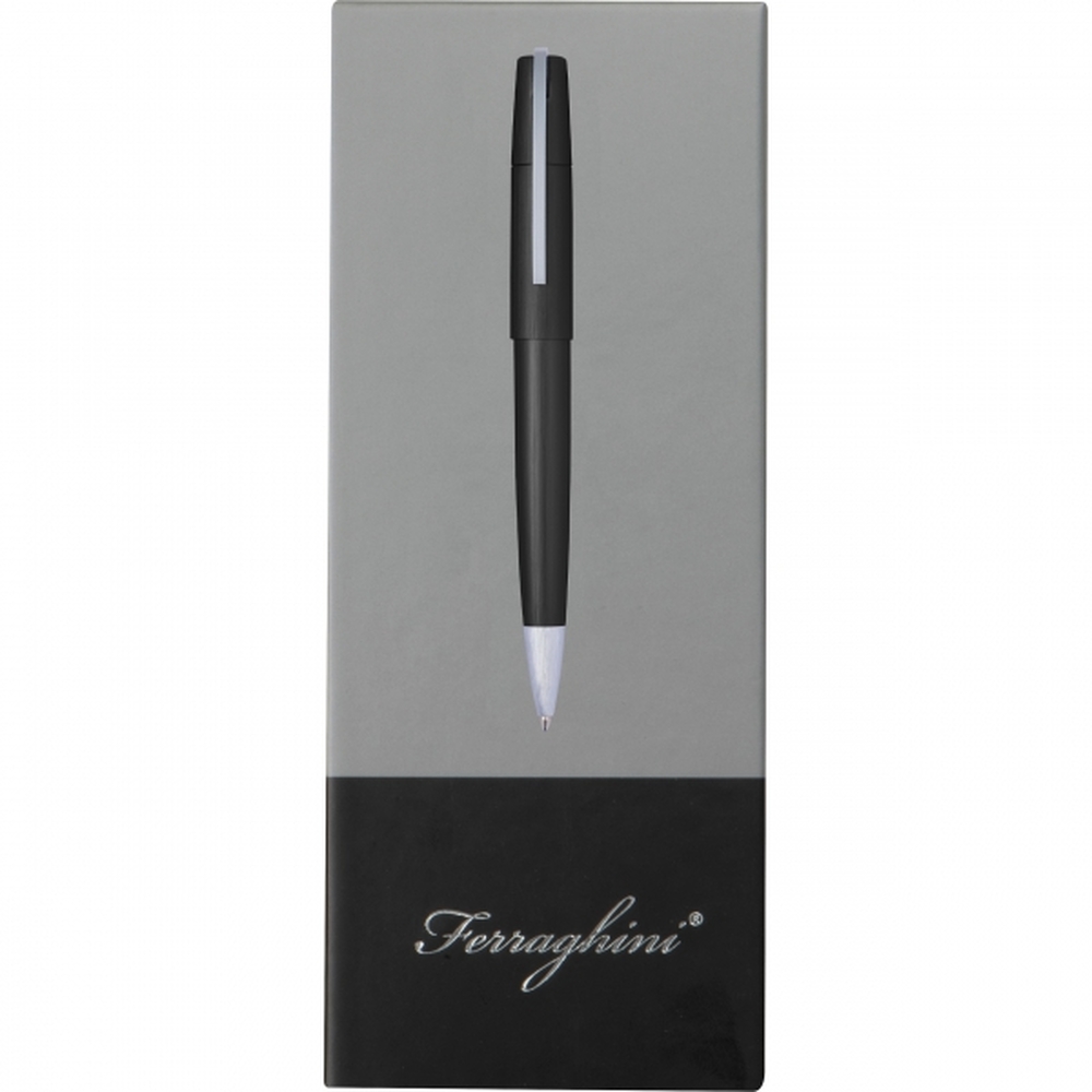 Przekręcany, metalowy długopis marki Ferraghini, ze srebrnymi akcentami i dużym wkładem piszącym na niebiesko.