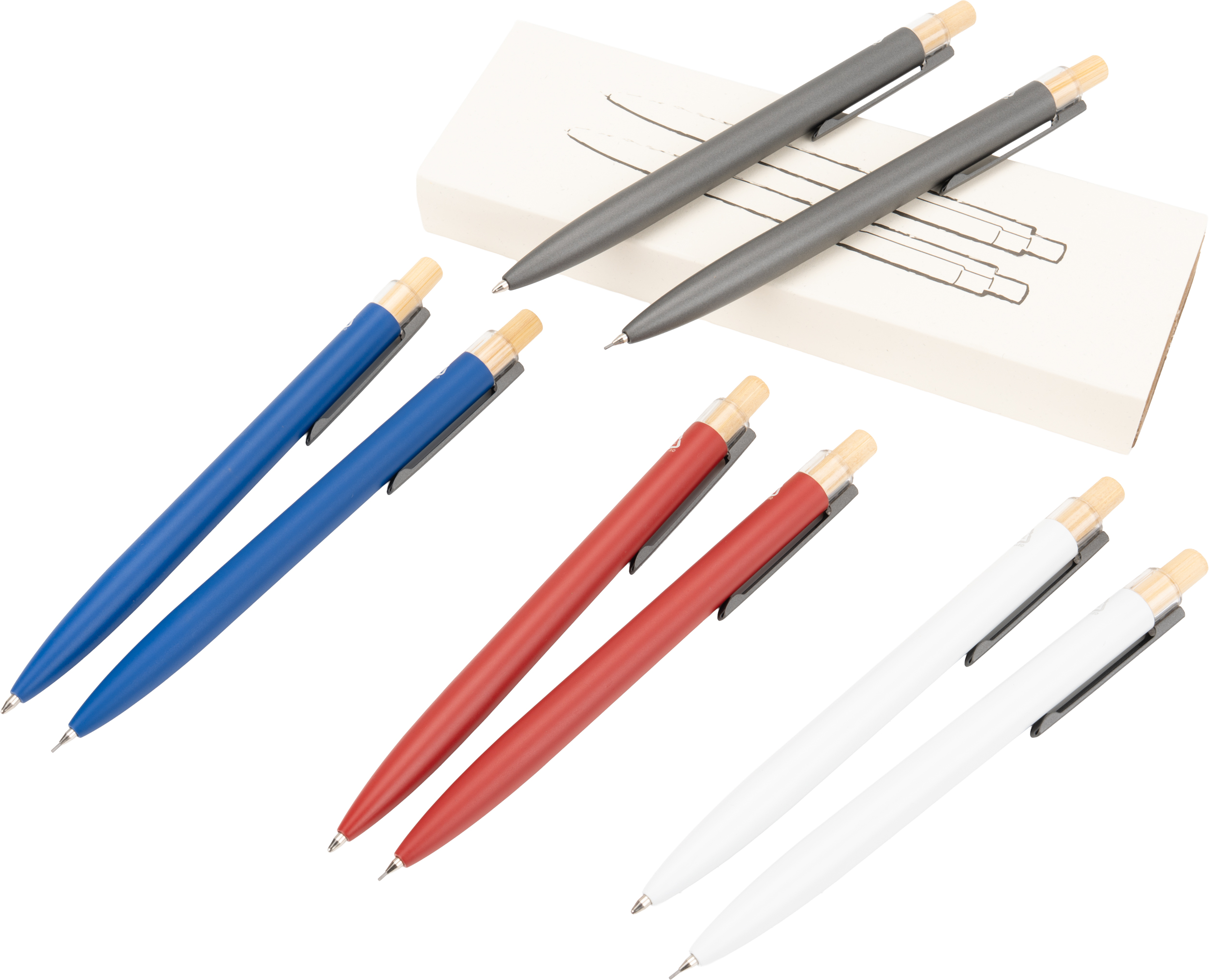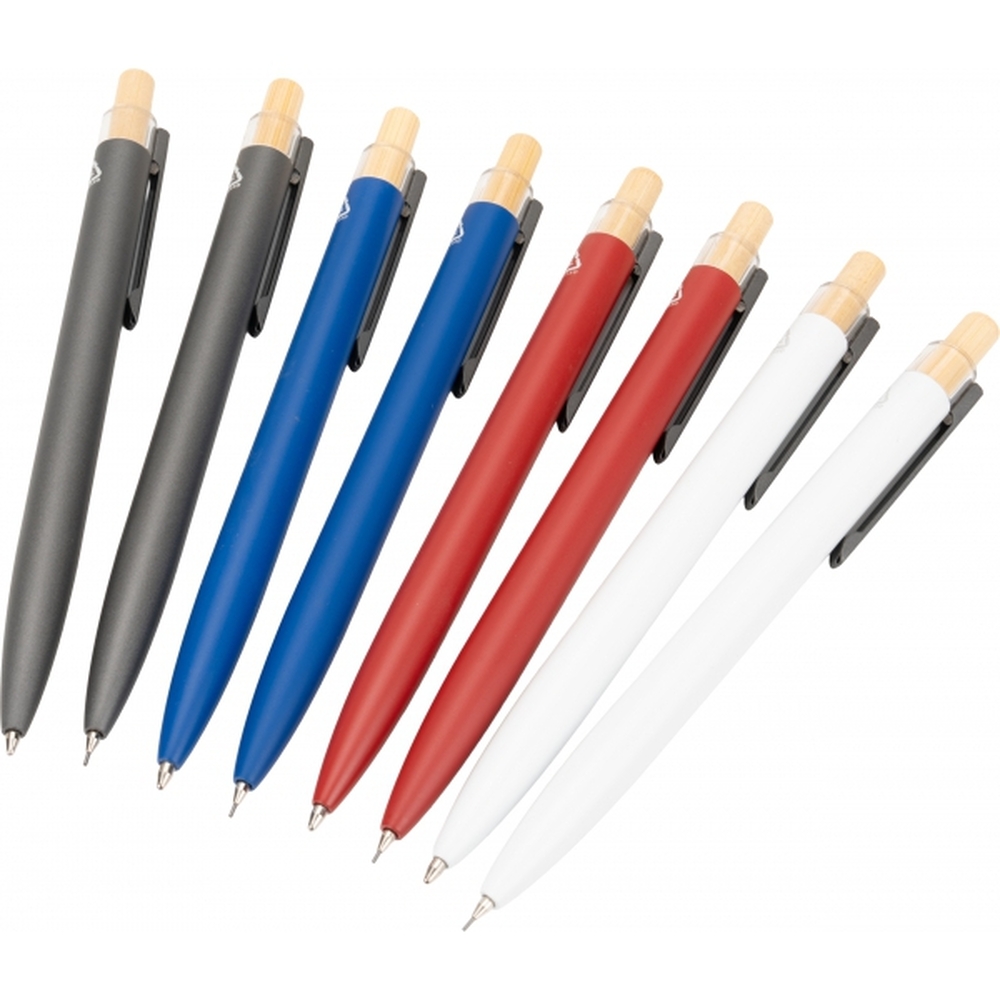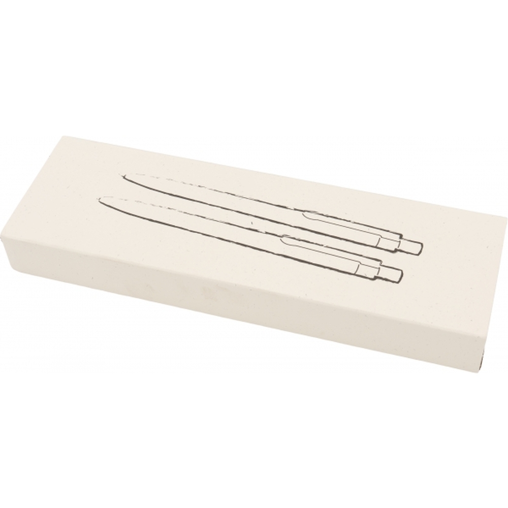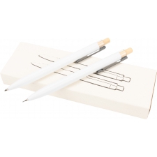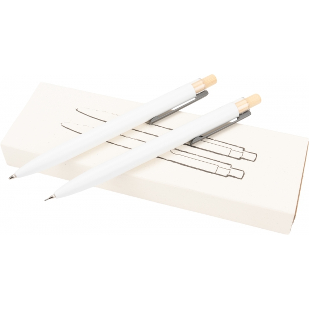 Zestaw piśmienny składający się z długopisu półżelowego, piszącego na niebiesko i ołówka automatycznego. Przybory piśmienne wykonane z aluminium pochodzącego z recyklingu, zapakowane w przyjazne środowisku pudełko.