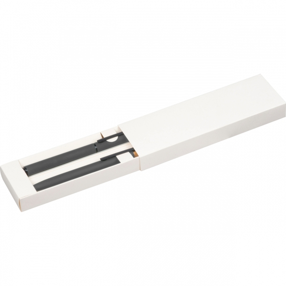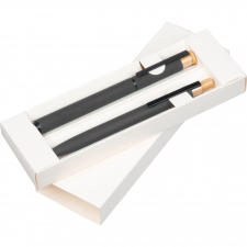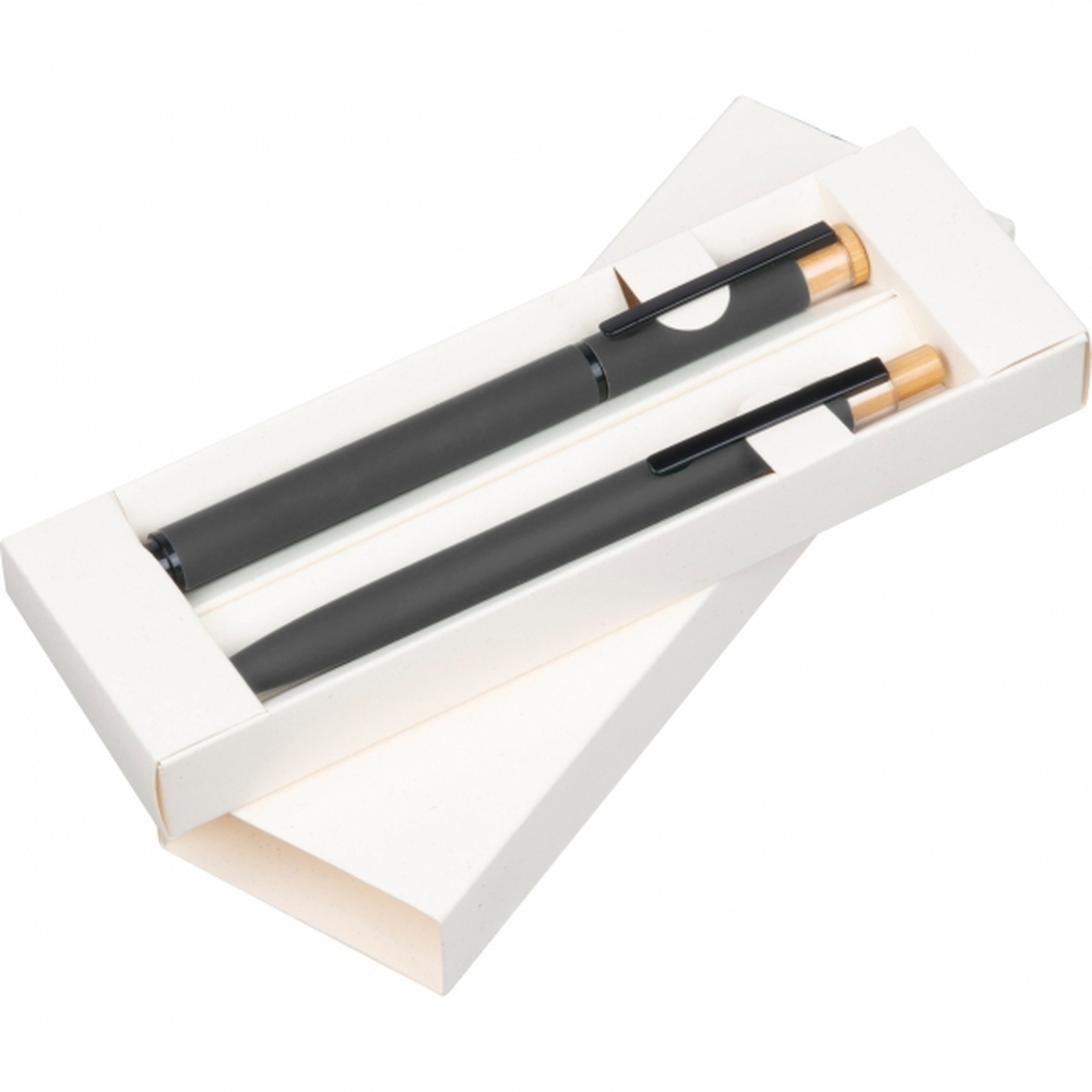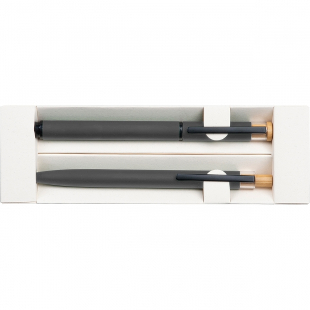 Zestaw piśmienny składający się z piszącego na niebiesko długopisu i pióra kulkowego, wykonany z aluminium z recyklingu. Całość zapakowana w pudełko.