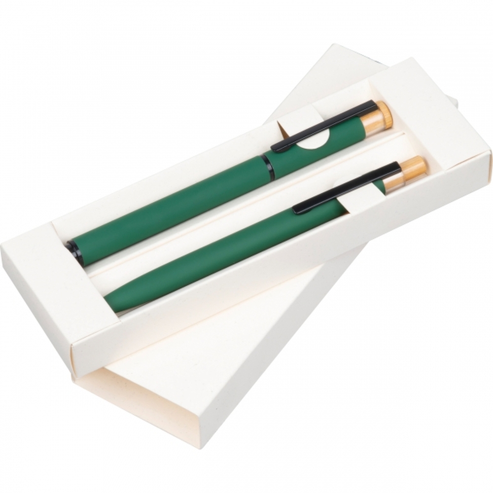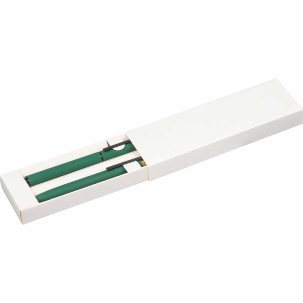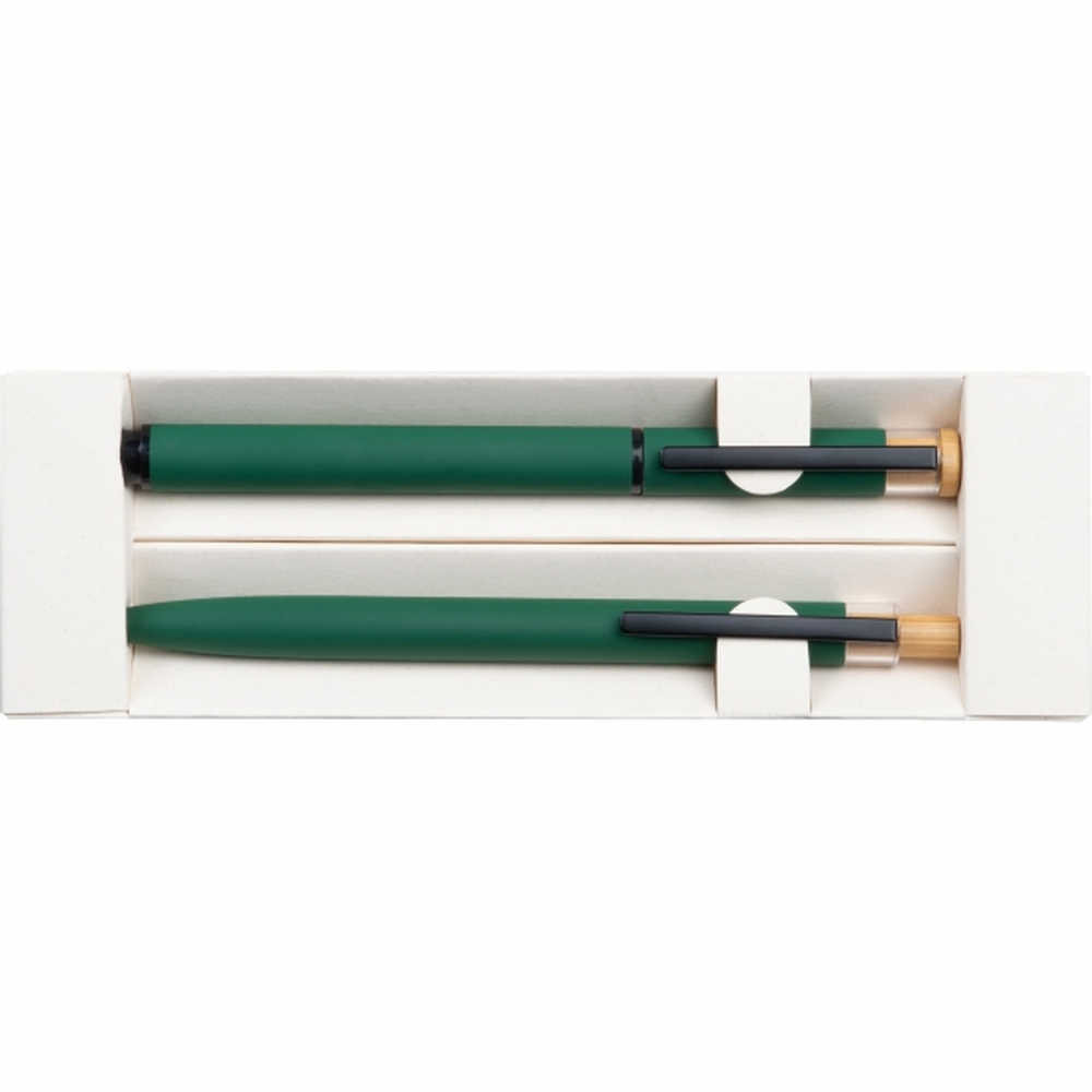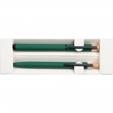 Zestaw piśmienny składający się z piszącego na niebiesko długopisu i pióra kulkowego, wykonany z aluminium z recyklingu. Całość zapakowana w pudełko.