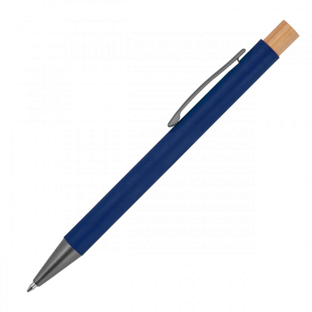 Długopis wykonany z aluminium z recyklingu, bambusowym przyciskiem, metalowym klipsem i wkładem piszącym na niebiesko.