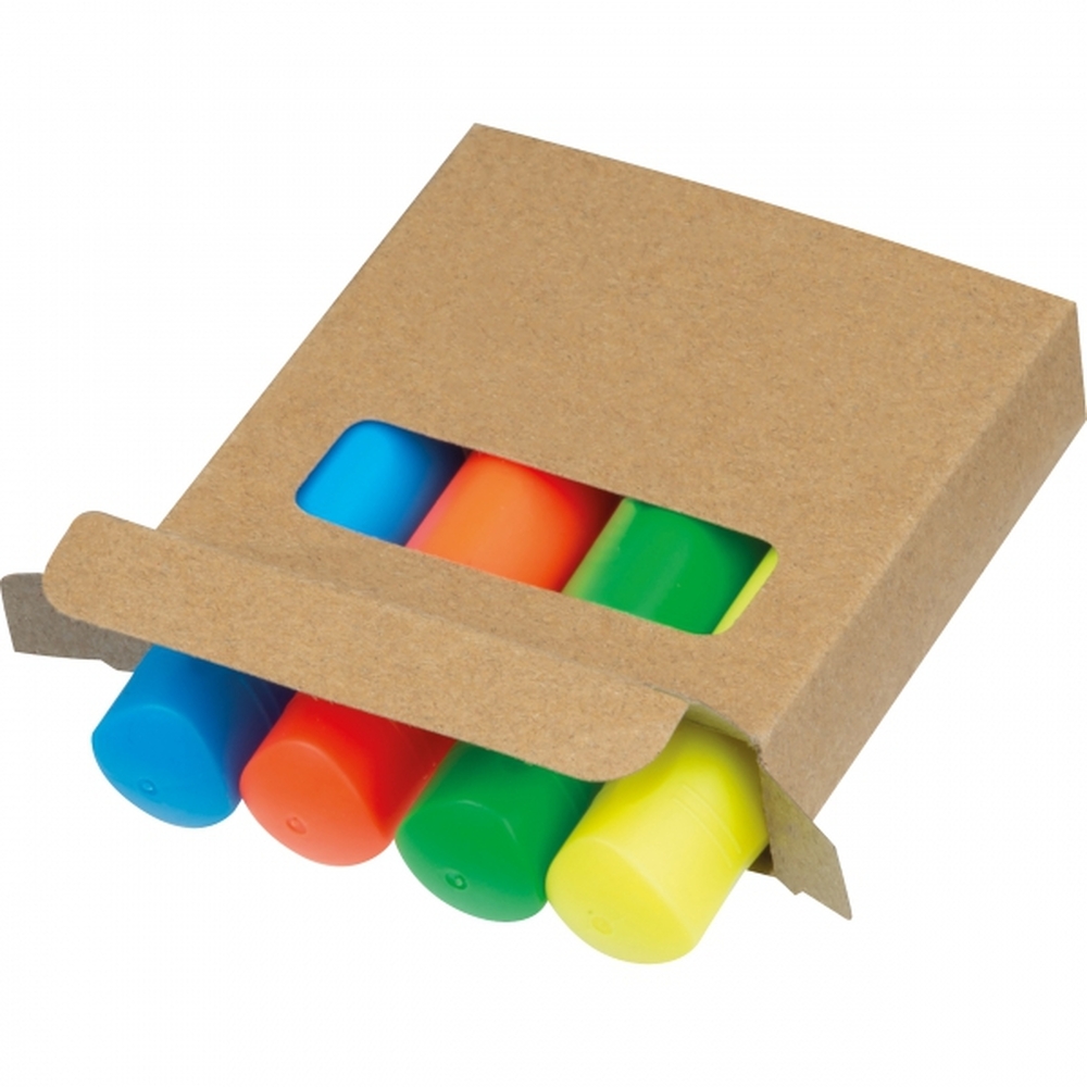 Zestaw 4 mini zakreślaczy w kolorze żółtym, niebieskim, zielonym i pomarańczowym, zapakowanych w kartonowe pudełko.