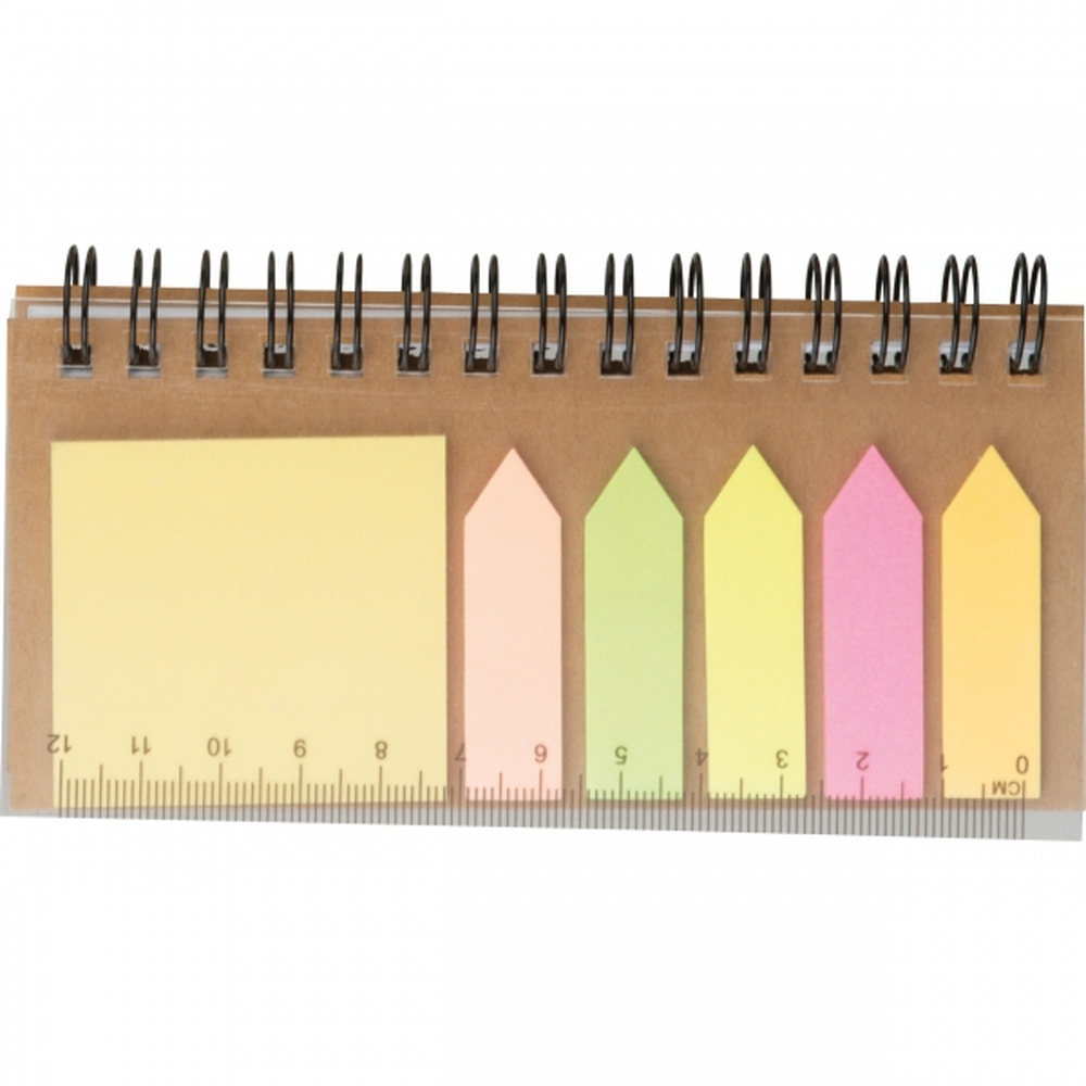 Notesik z kartkami do notowania w linie (40 kartek), małymi karteczkami samoprzylepnymi (25 szt.) , kolorowymi karteczkami do markowania (po 25 szt. z koloru) i linijką na okładce.