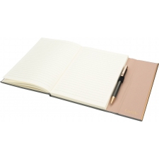 Zestaw, składający się z notesu z 96 kartkami w linie, w oprawie ze skóry pochodzącej z recyklingu i dopasowanego kolorystycznie długopisu.