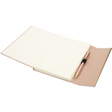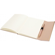 Zestaw, składający się z notesu z 96 kartkami w linie, w oprawie ze skóry pochodzącej z recyklingu i dopasowanego kolorystycznie długopisu.