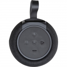 Okrągły, bezprzewodowy głośnik bluetooth, z baterią o pojemności 800 mAh (5V), diodami LED i kabelkiem do ładowania. Głośnik posiada złącze USB typu C, slot na kartę SD oraz mały uchwyt do przenoszenia.