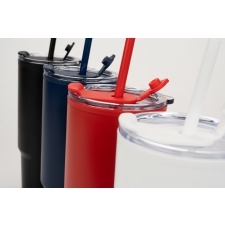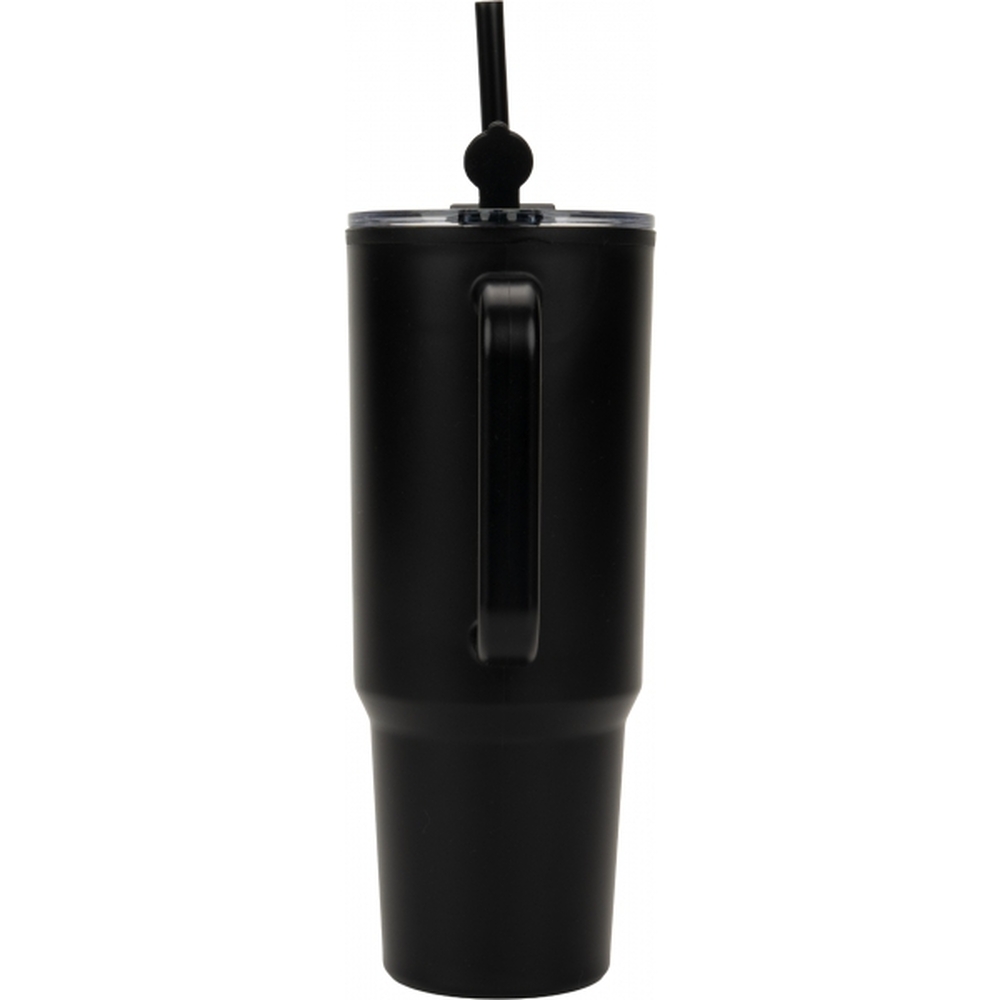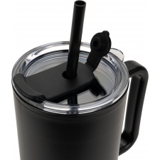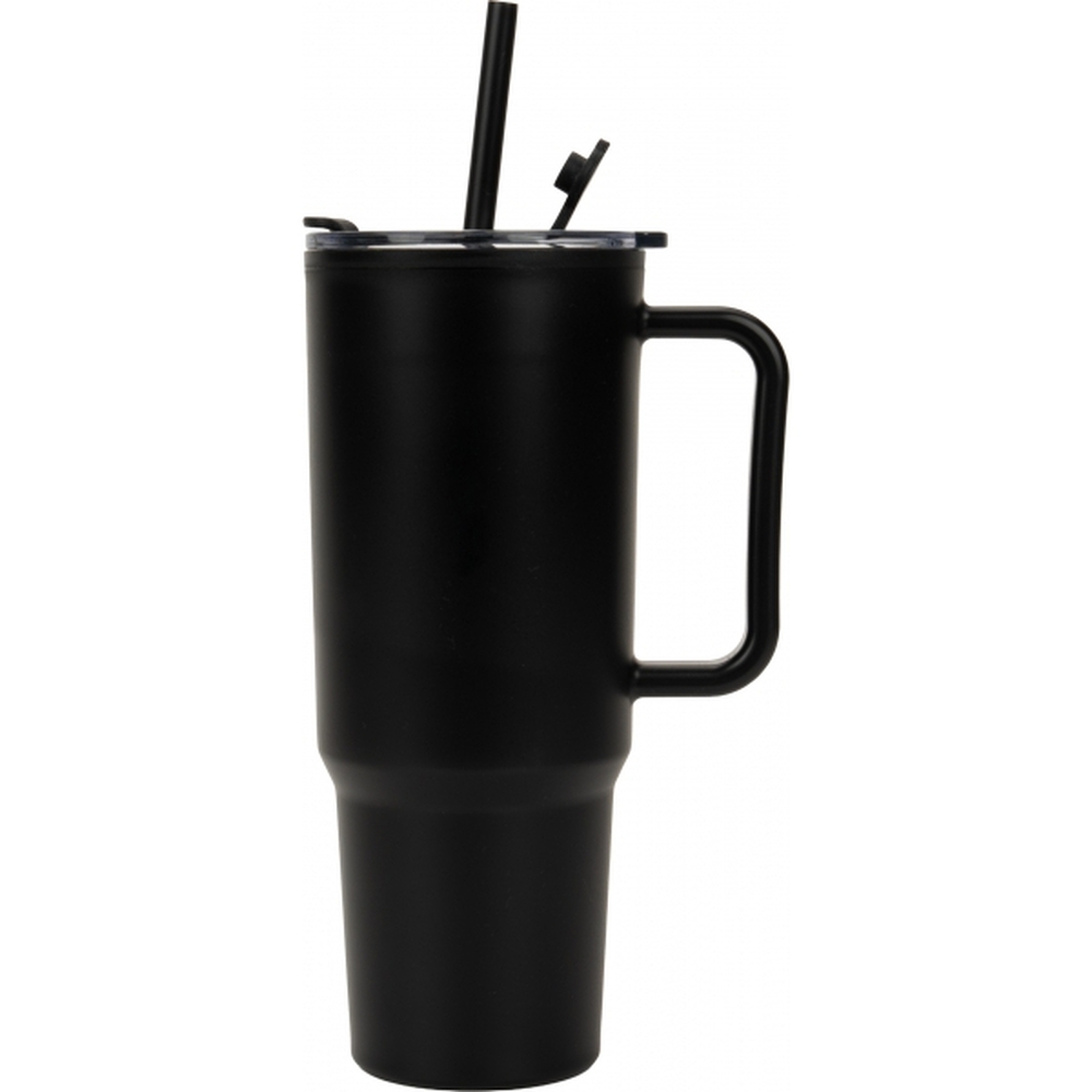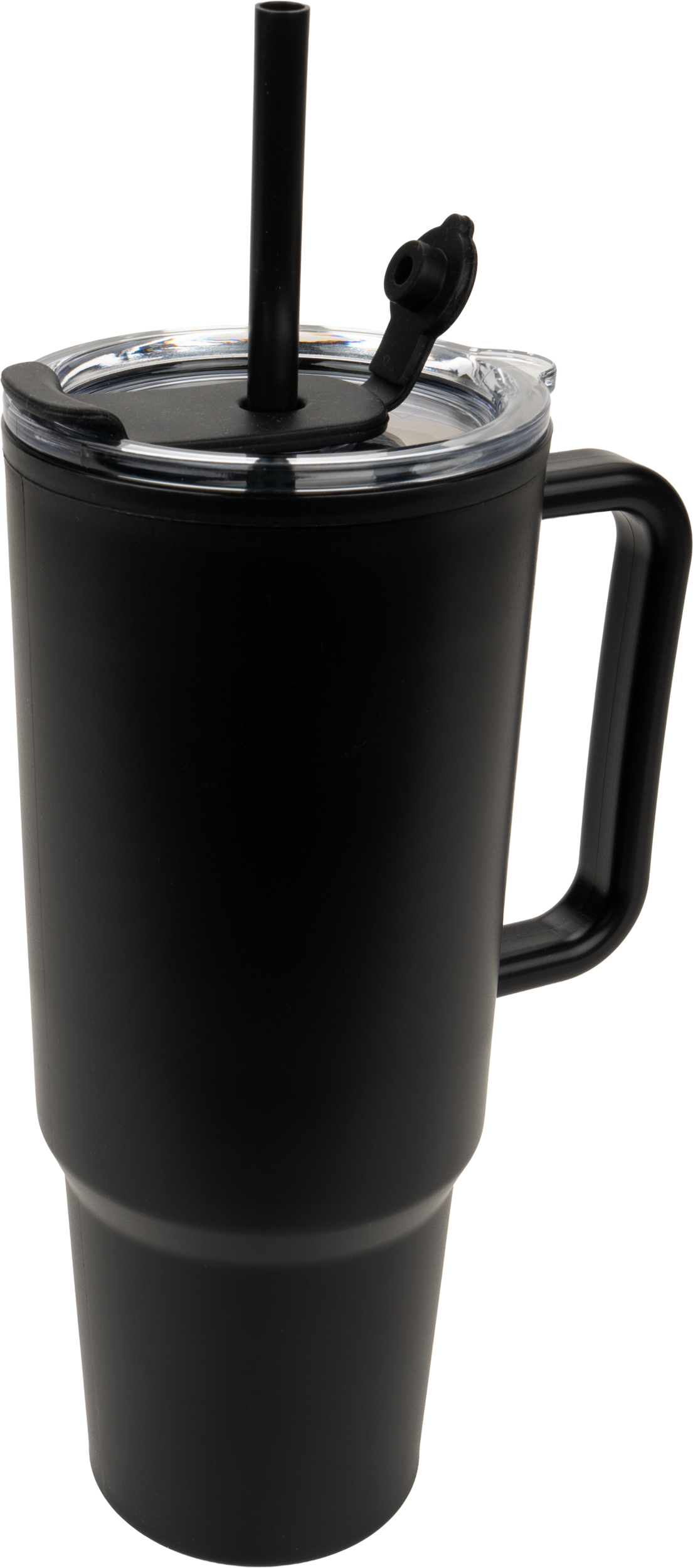Kubek XXL, o pojemności 1200 ml, z podwójnymi ściankami, uchwytem do przenoszenia i słomką do picia.