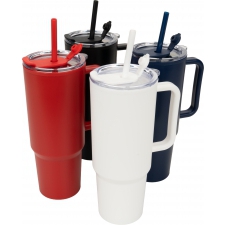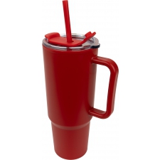 Kubek XXL, o pojemności 1200 ml, z podwójnymi ściankami, uchwytem do przenoszenia i słomką do picia.