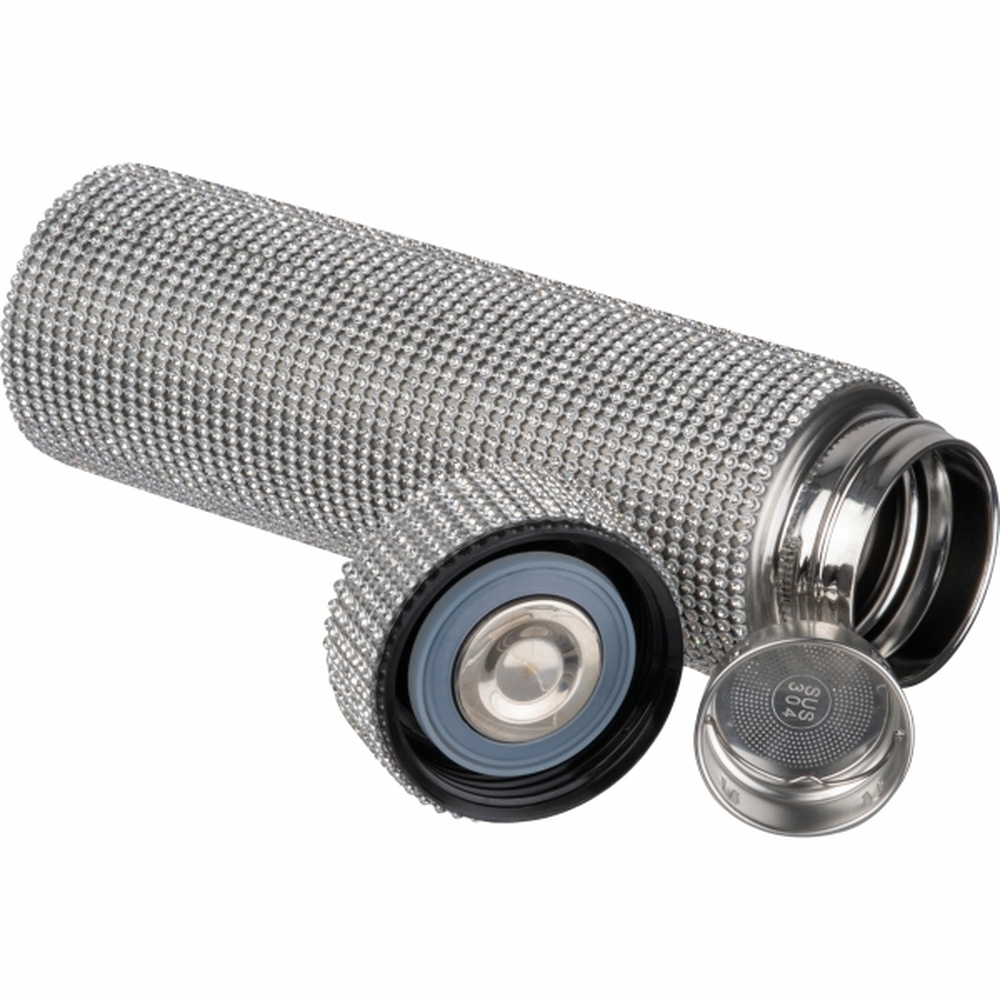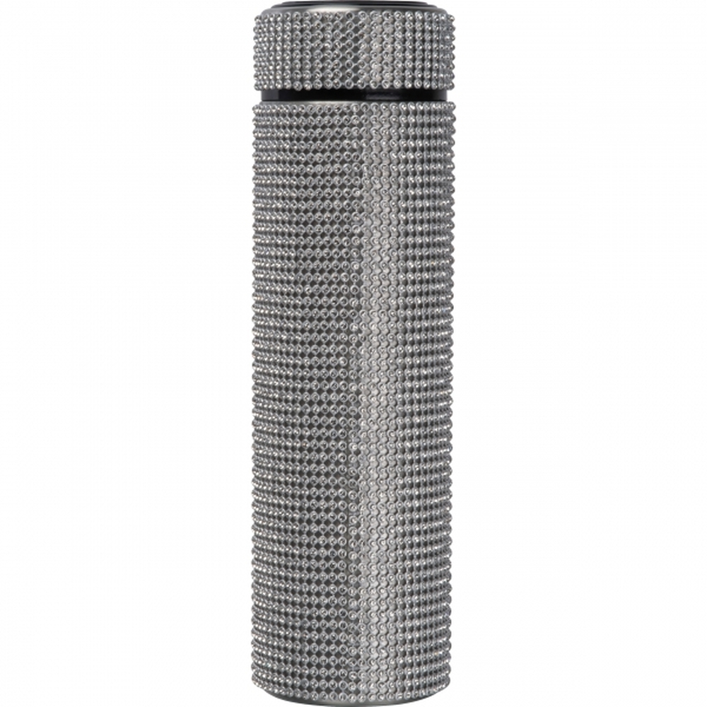 Butelka termiczna z podwójnymi ściankami, wykonana ze stali nierdzewnej ozdobionej cyrkoniami, pojemność 500 ml.