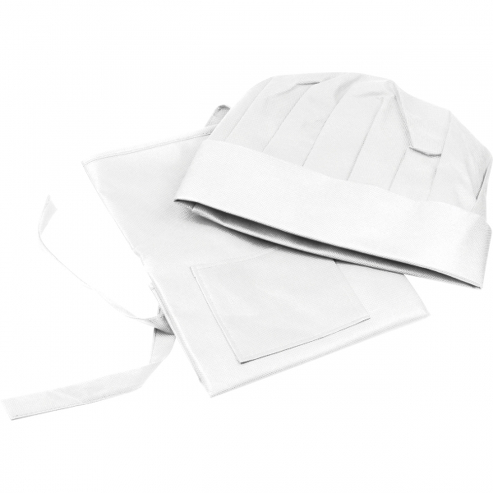Zestaw dla dzieci, składający się z fartuszka i dopasowanej czapki kucharskiej, wykonanych z non-woven.