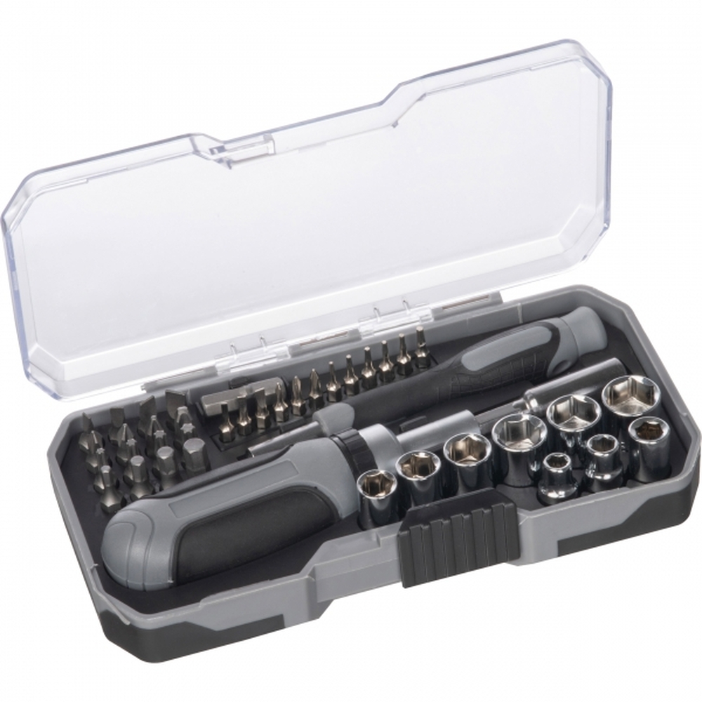 Zestaw 41 bitów i nakrętek oraz dwa uchwyty, całość w poręcznym pudełku.