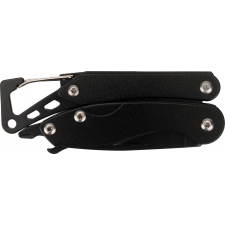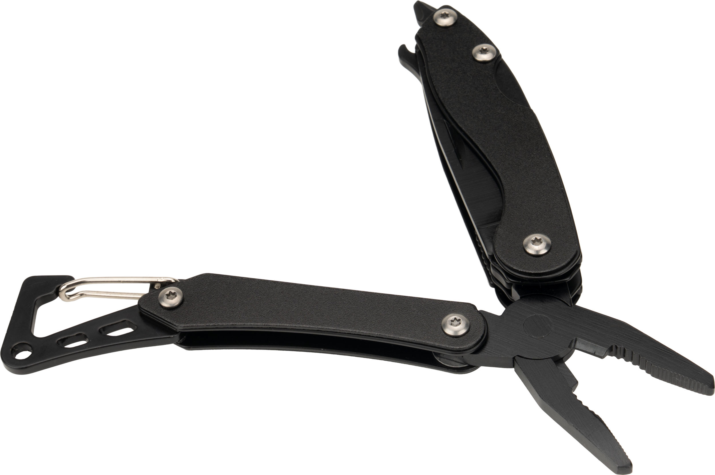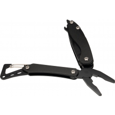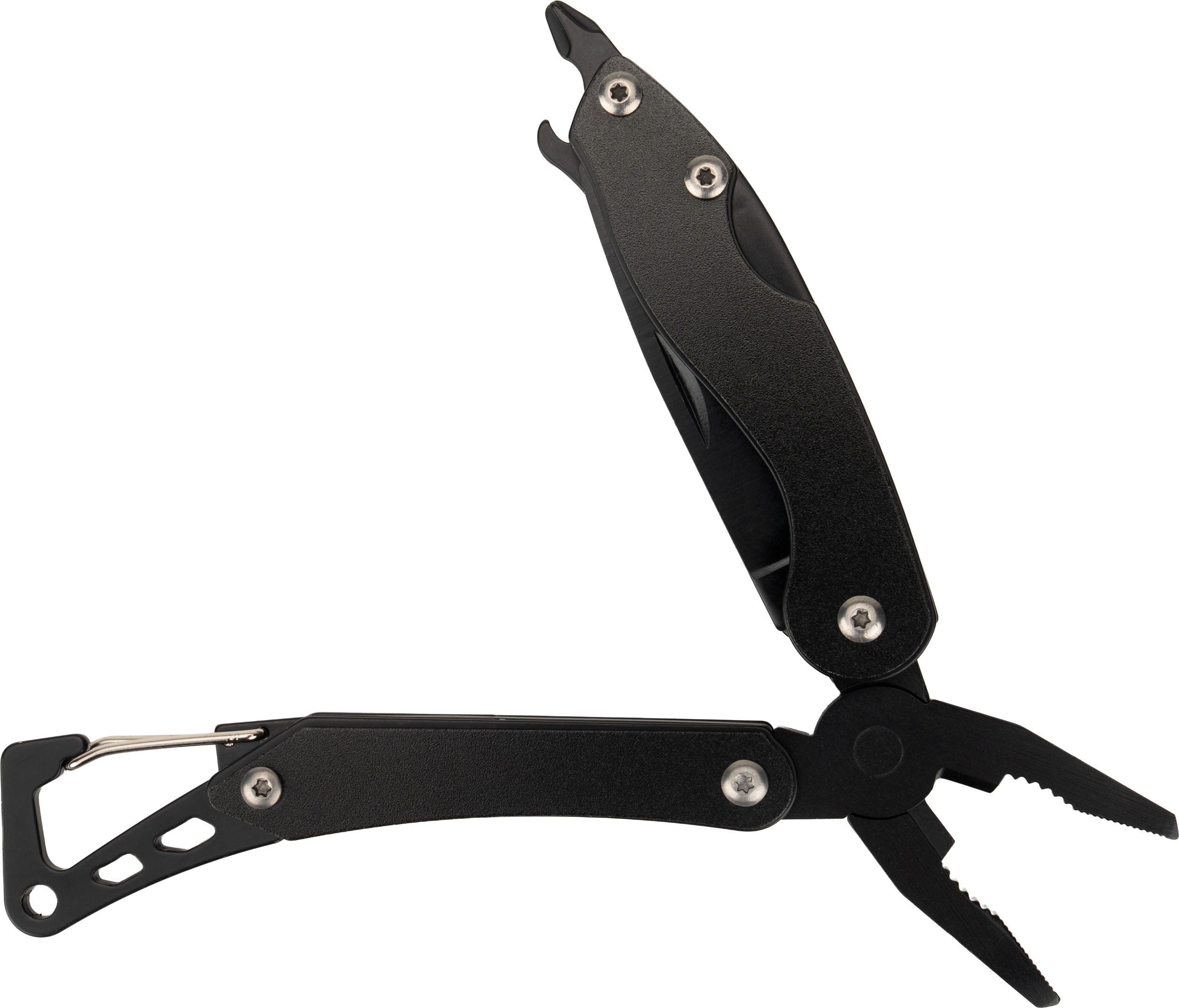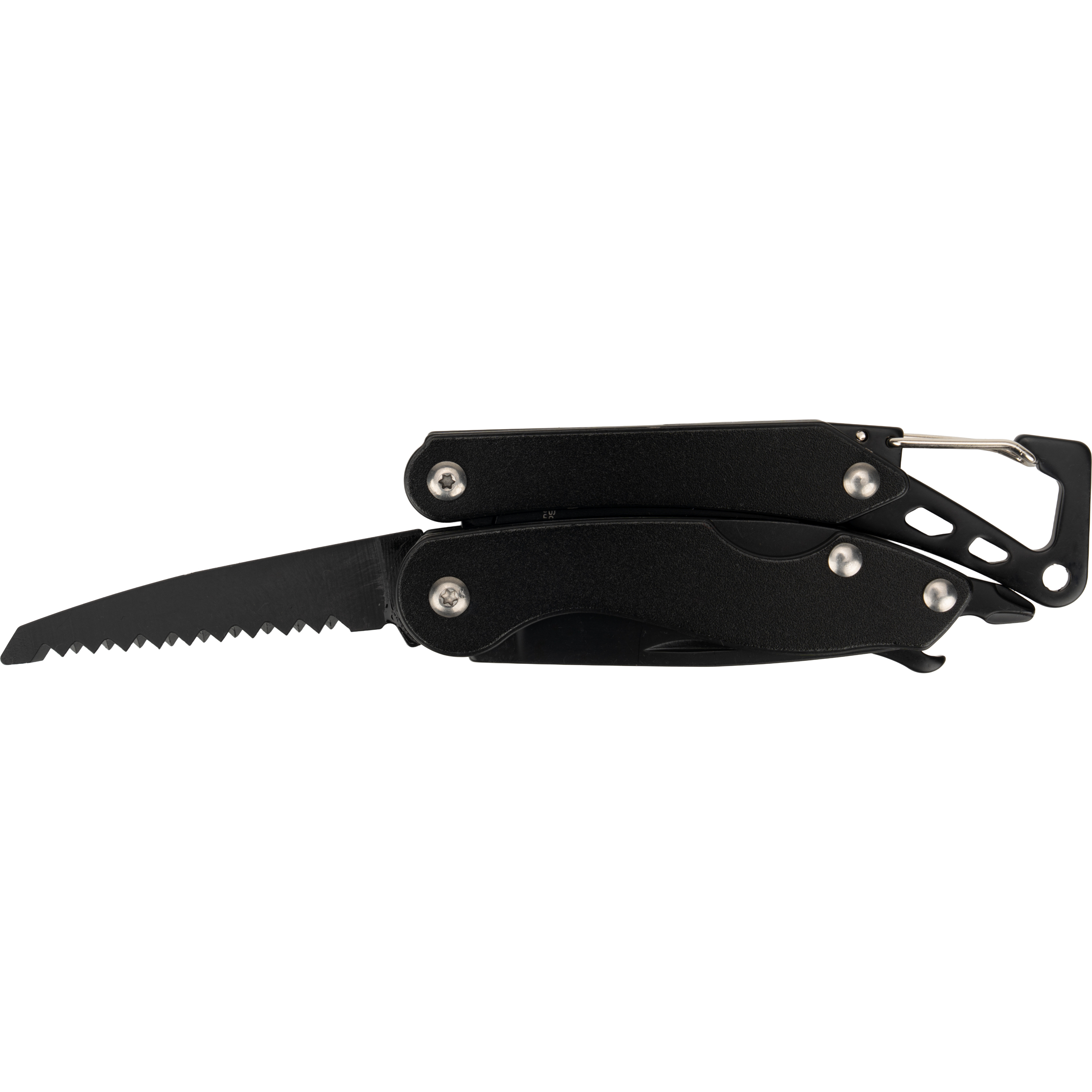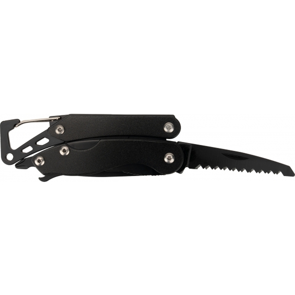 Wielofunkcyjne narzędzie z 6 funkcjami: nóż, piła, szczypce, karabińczyk, otwieracz do butelek i śrubokręt Phillips.