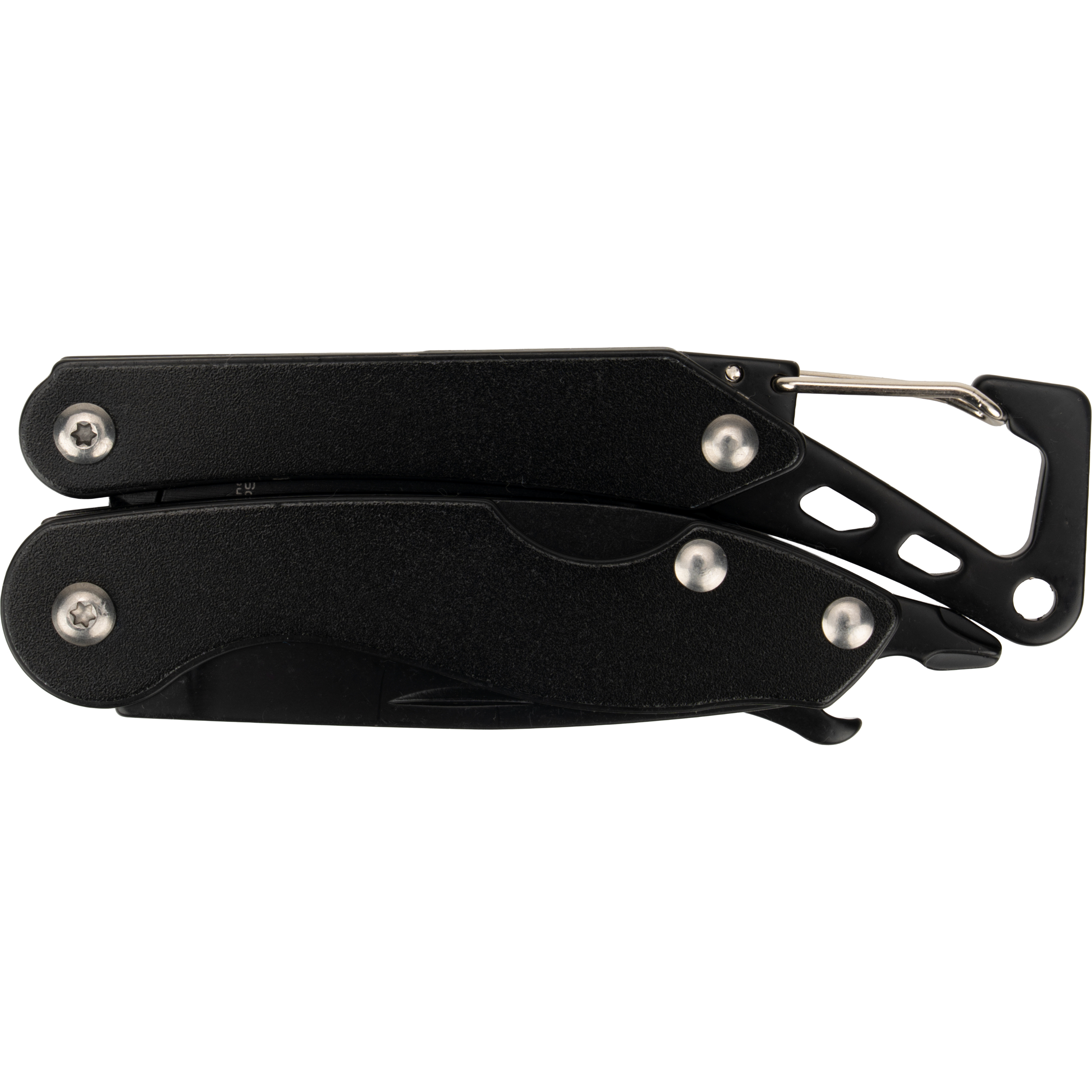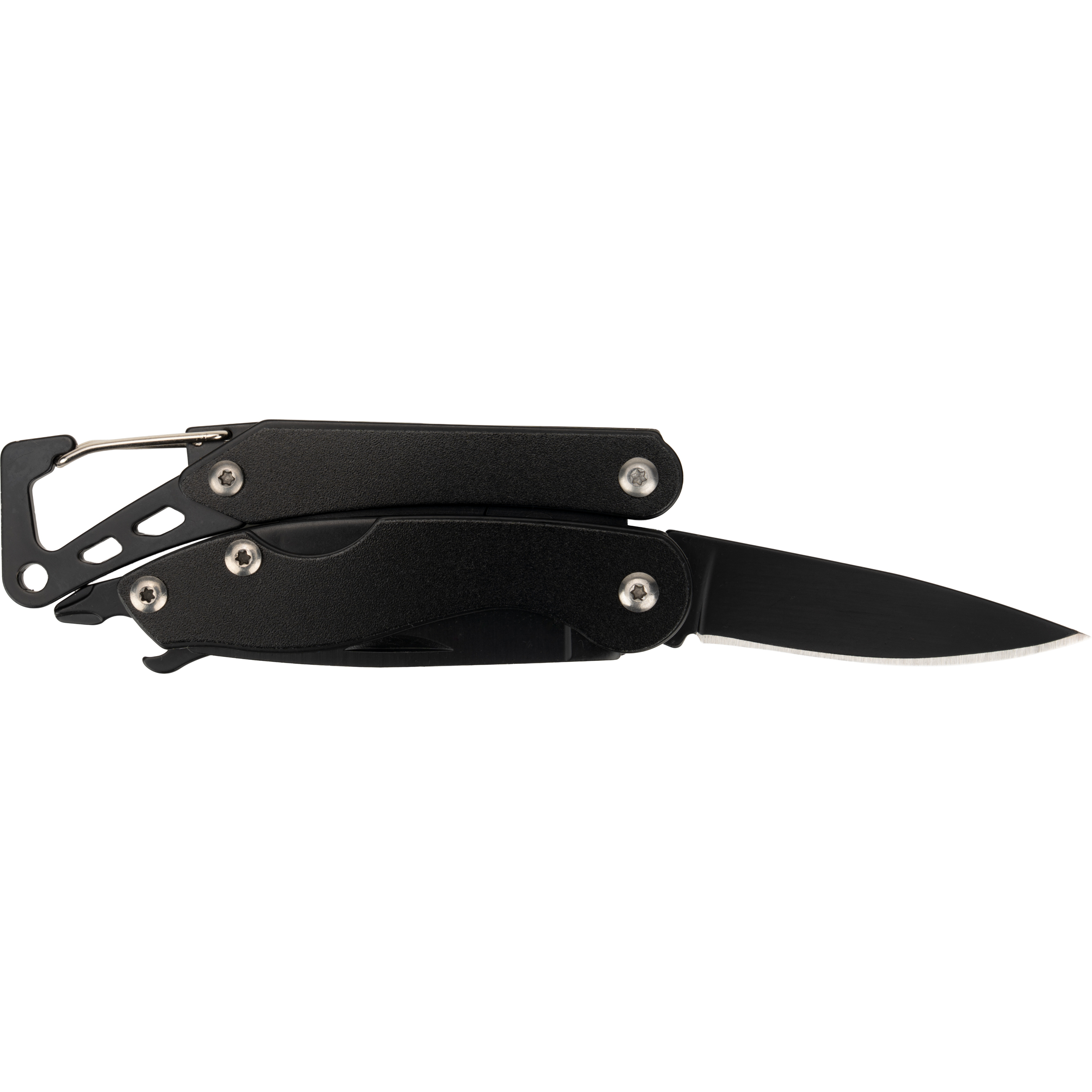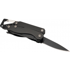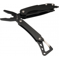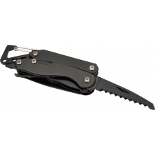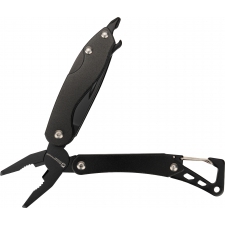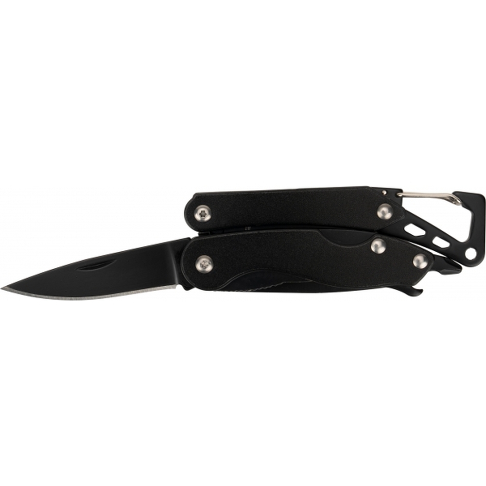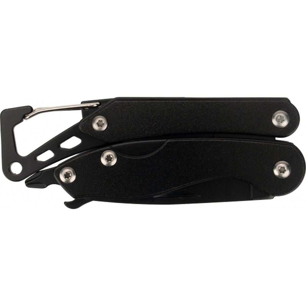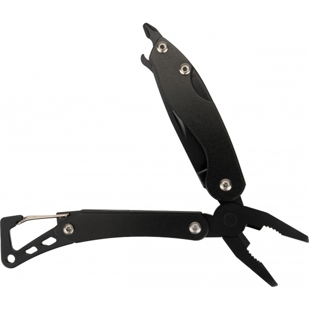 Wielofunkcyjne narzędzie z 6 funkcjami: nóż, piła, szczypce, karabińczyk, otwieracz do butelek i śrubokręt Phillips.