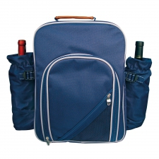 Plecak piknikowy z poliestru, z wyposażeniem dla 4 osób. Posiada komorę chłodzącą na jedzenie oraz kieszenie chłodzące na butelki, plastikowy zestaw naczyń i sztućców, małą deskę, korkociąg, pojemniczki na pieprz i sól oraz nóż.