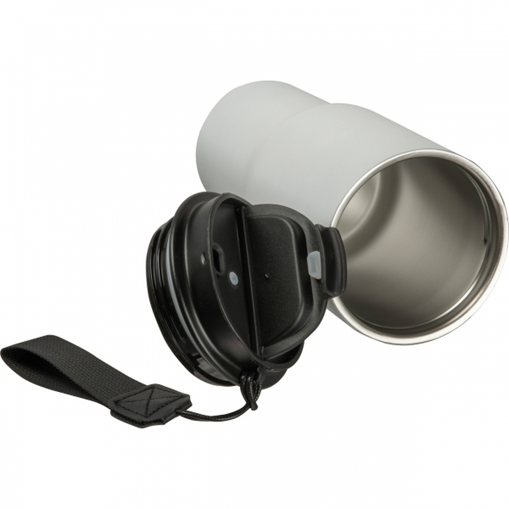 Kubek termiczny, wykonany ze stali nierdzewnej z recyklingu, z podwójnymi ściankami, o pojemności 550 ml. Kubek posiada praktyczny pasek do przenoszenia.