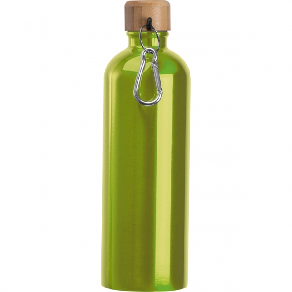Butelka wykonana ze stali nierdzewnej, o pojemności 750 ml, z bambusową zakrętką do której został przymocowany karabińczyk.