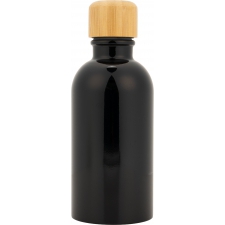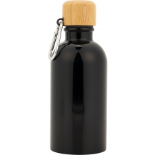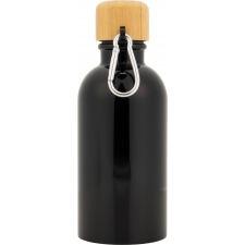 Butelka wykonana ze stali nierdzewnej, o pojemności 400 ml, z bambusową zakrętką do której został przymocowany karabińczyk.