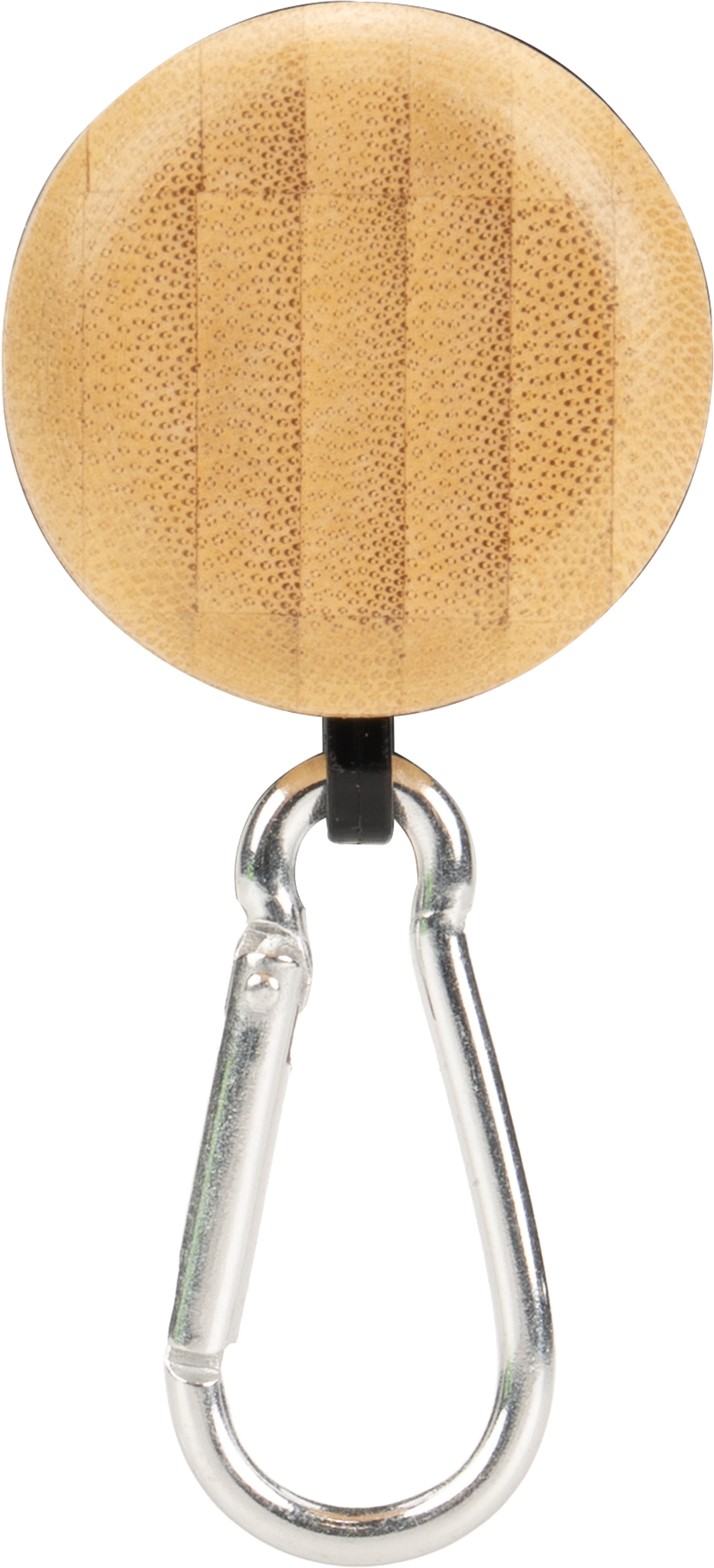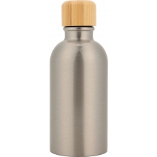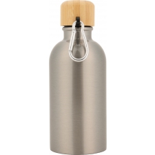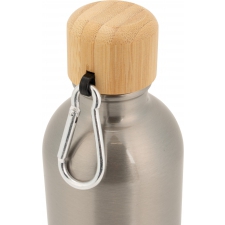 Butelka wykonana ze stali nierdzewnej, o pojemności 400 ml, z bambusową zakrętką do której został przymocowany karabińczyk.
