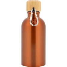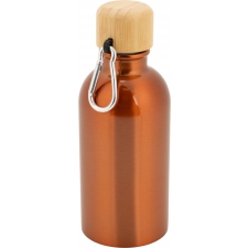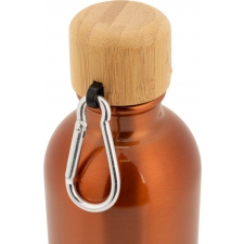 Butelka wykonana ze stali nierdzewnej, o pojemności 400 ml, z bambusową zakrętką do której został przymocowany karabińczyk.