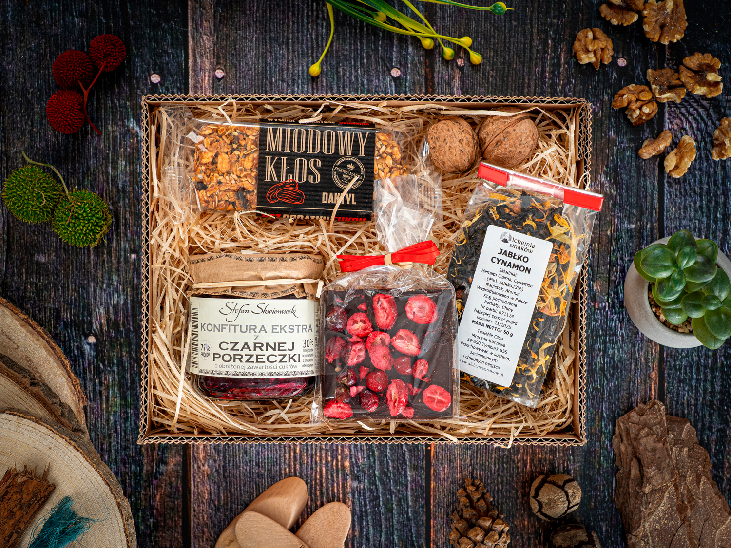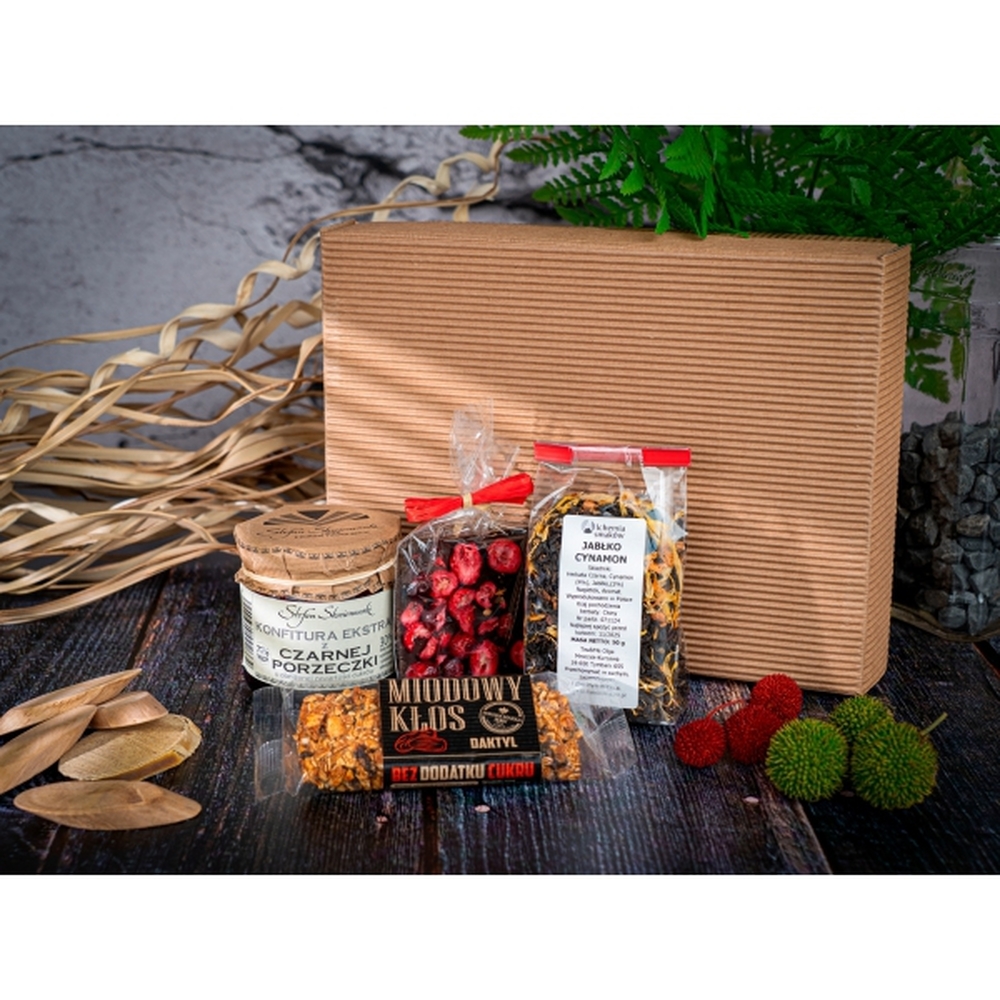 Aromatyczna herbata o smaku jabłka i cynamonu (50 g) wprowadza w przytulny nastrój, a konfitura extra z czarnej porzeczki (200 g) zachwyca intensywnym, owocowym charakterem. Całość zapakowana jest w eleganckie opakowanie z dekoracyjnym wypełnieniem i naturalną rafią, dzięki czemu zestaw prezentuje się stylowo i jest gotowy do wręczenia. To idealna propozycja dla każdego, kto zasługuje na chwilę relaksu - z klasą i smakiem.