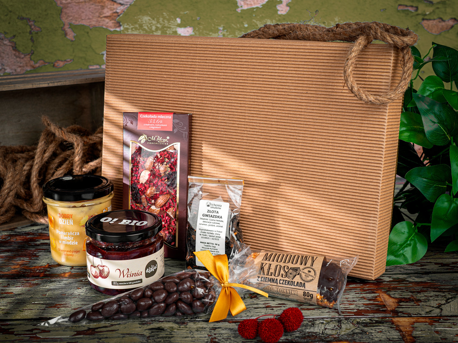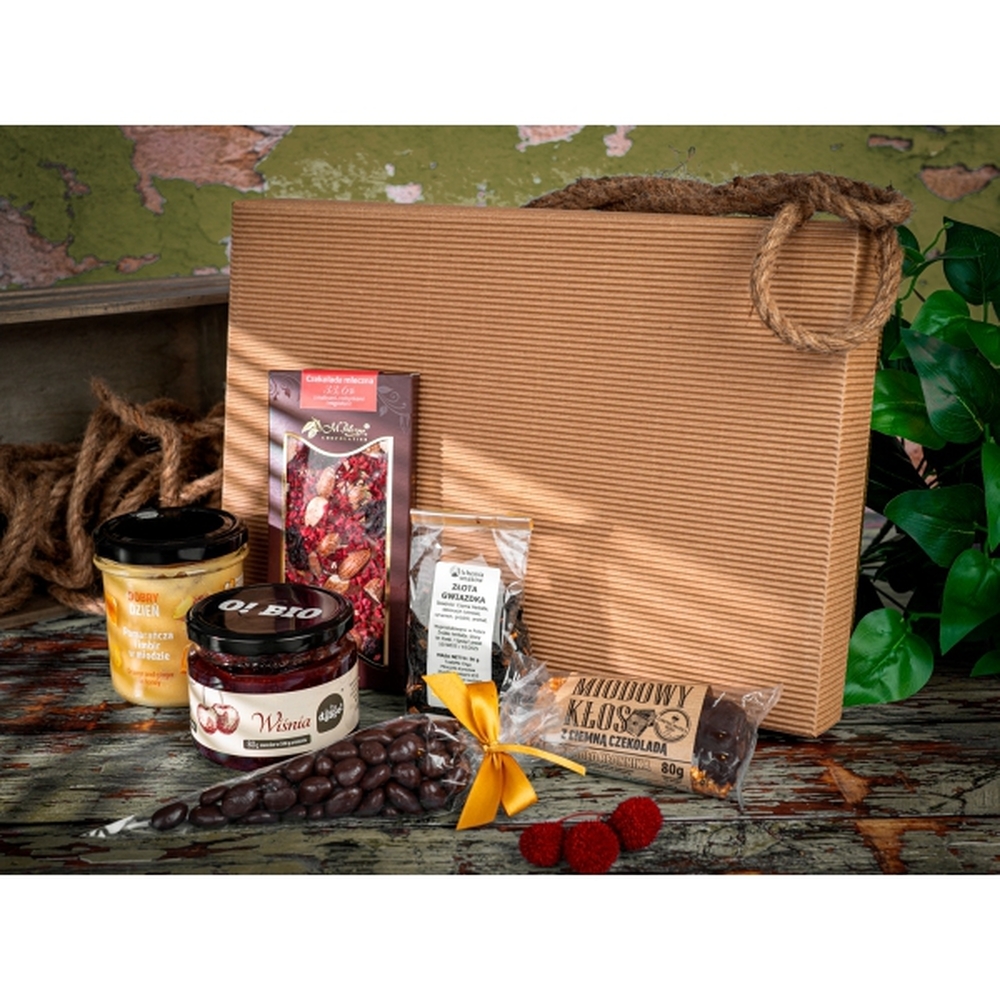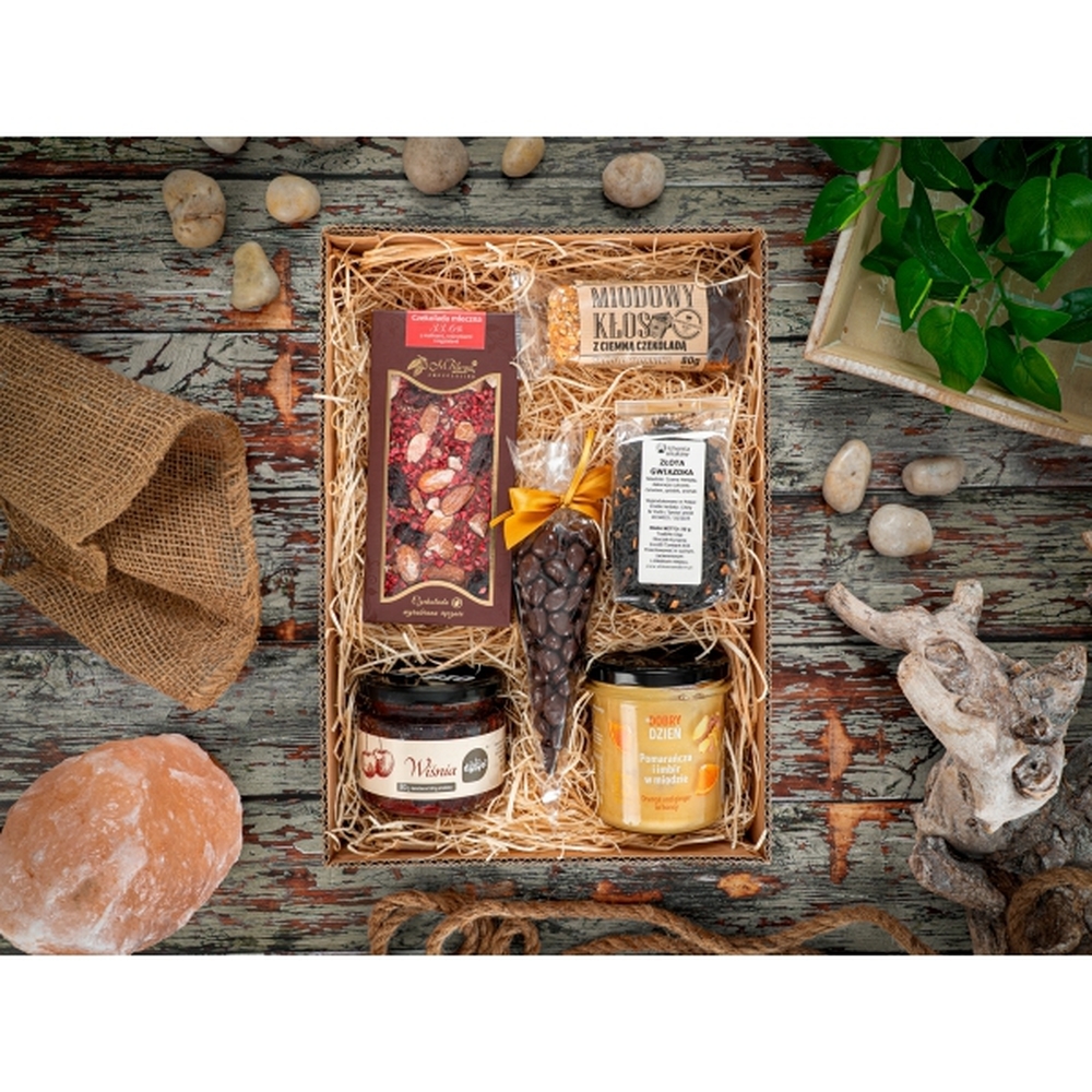 Konfitura wiśniowa (295 g), pełna intensywnego, głębokiego smaku, doskonale sprawdzi się jako dodatek do pieczywa, serów czy deserów. Wyjątkowym akcentem jest miód z pomarańczą i imbirem (375 g), który łączy naturalną słodycz z cytrusową nutą imbiru - idealny na chłodne dni lub jako dodatek do herbaty i potraw. W zestawie nie mogło też zabraknąć aromatyzowanej herbaty Złota Gwiazdka (50 g), której ciepły, korzenny zapach wprowadza w przytulny nastrój.