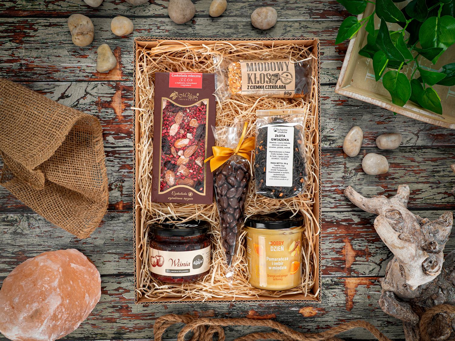 Dopełnieniem są słodkie przekąski: batonik miodowy Kłos oblany ciemną czekoladą (80 g), będący sycącym połączeniem naturalnych składników, oraz bakalie (żurawina/agrest) w deserowej czekoladzie (80 g), które rozpływają się w ustach i pozostawiają delikatny, owocowo-czekoladowy posmak. Całość została zapakowana w stylowe pudełko z dekoracyjnym wypełnieniem i ozdobną rafią, co czyni zestaw gotowym do wręczenia bez potrzeby dodatkowego opakowania. „Zmysłowe Smaki” to prezent, który zachwyca elegancją i bogactwem smaków.