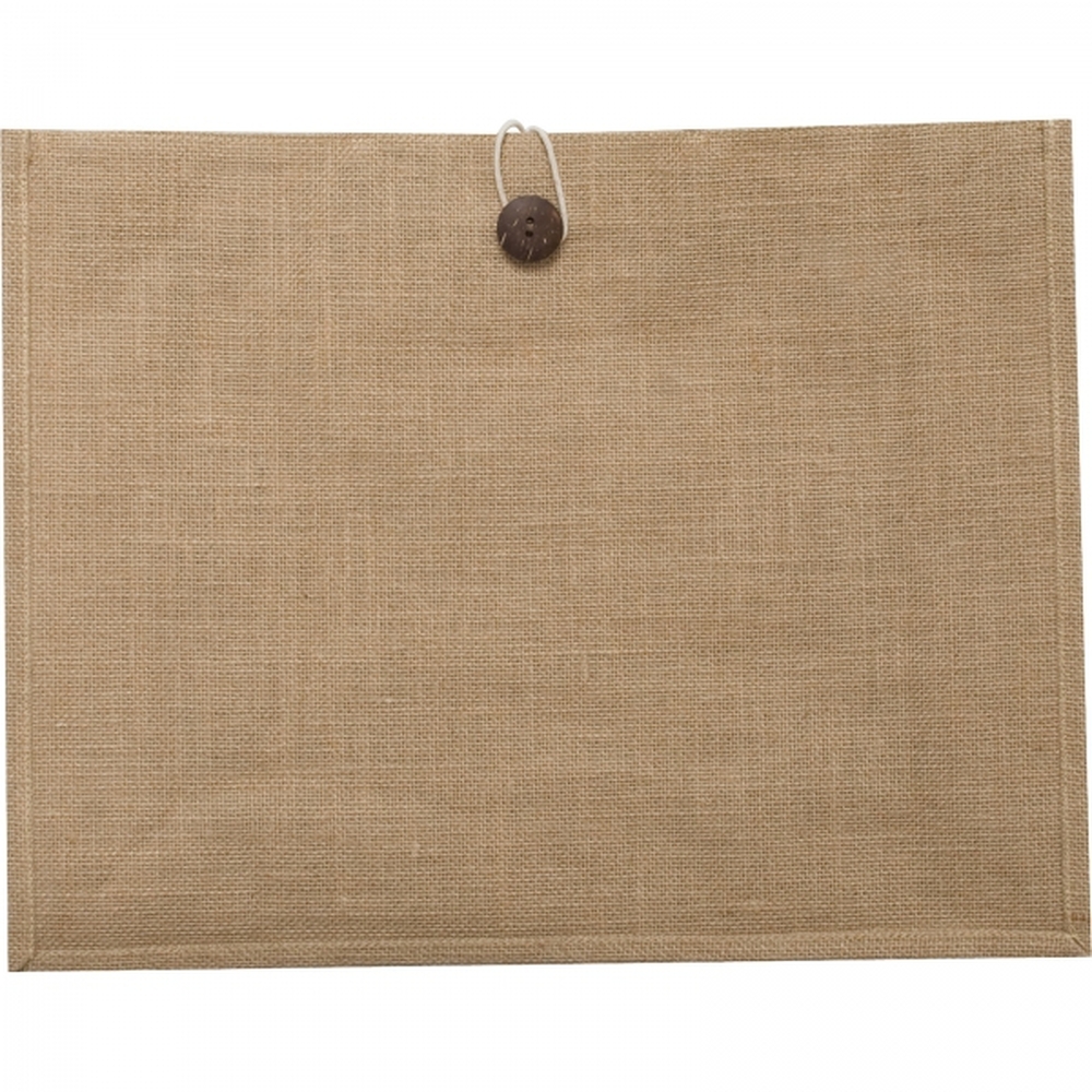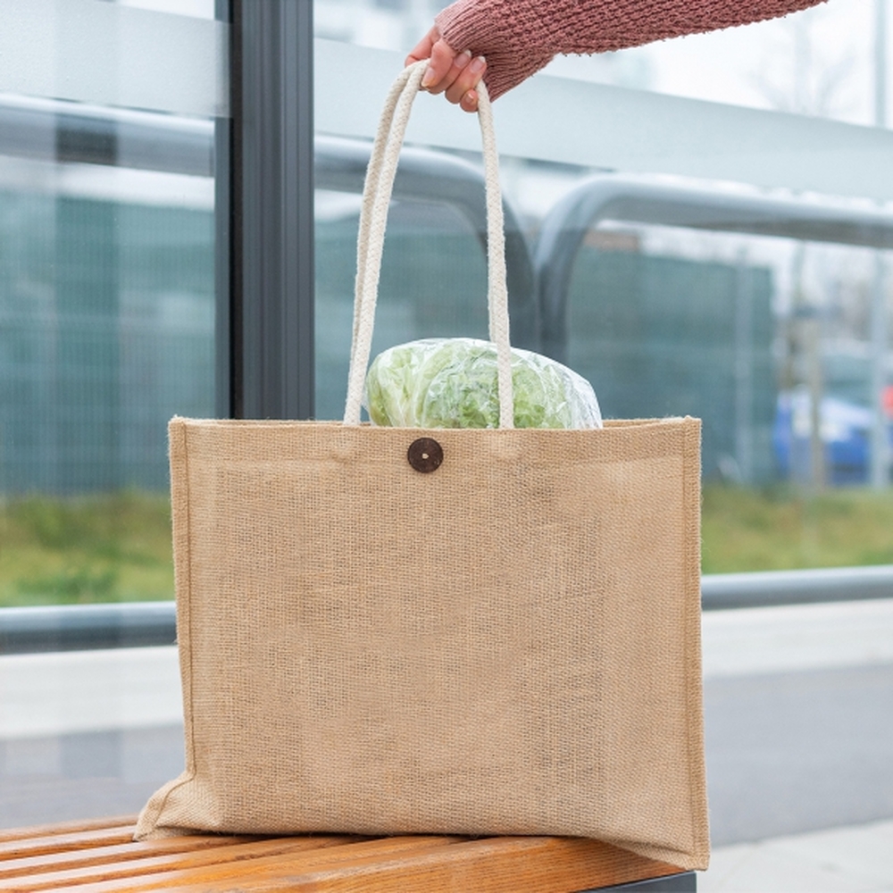 Ekologiczna torba z juty, w naturalnym kolorze, z uchwytami wykonanymi z mocnego sznurka, zamykana na guzik.