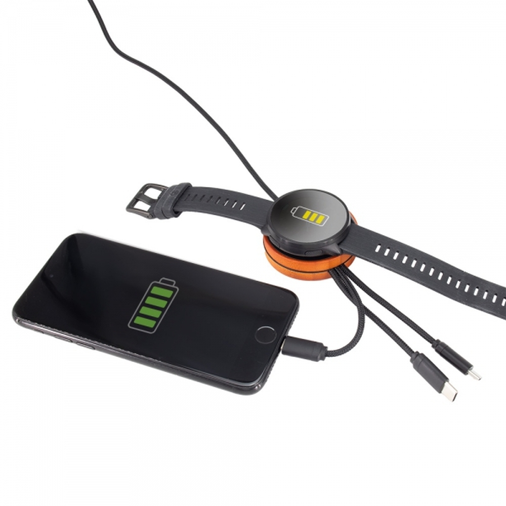 Kabel do ładowania z 3 końcówkami: micro USB, type C i lightning oraz przejściówką do ładowania USB/type C. Dodatkowo okrągła obudowa służy do ładowania bezprzewodowego np. smart watcha. Moc wejściowa: 5V 2A Moc wyjściowa ładowarki bezprzewodowej: 5V 1A