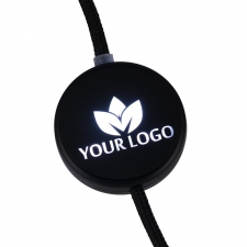 Długi kabel z 3 końcówkami w formie przjściówek type C/lightning/micro USB i wejściem do ładowania USB/type C. Po wygrawerowaniu logo jest podświetlone od spodu.