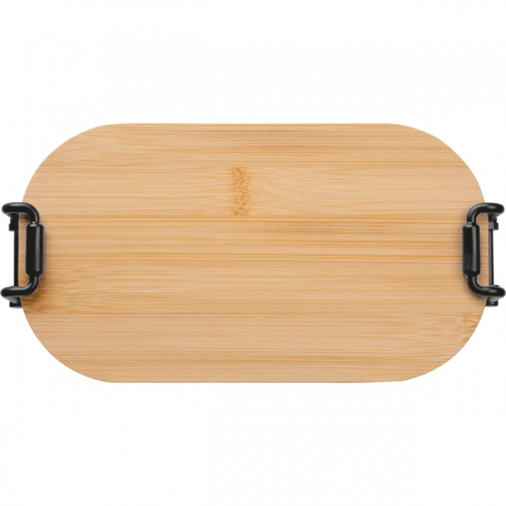 Pudełko na lunch, o pojemności 750 ml, z bambusową pokrywką i metalowymi zaciskami, zamykającymi pudełko.