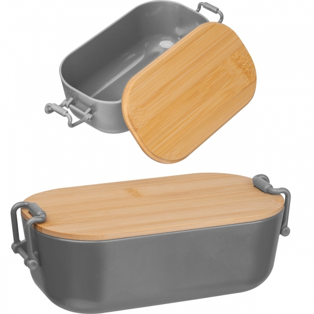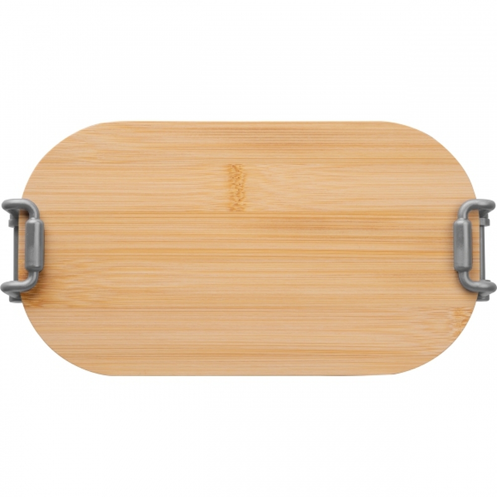 Pudełko na lunch, o pojemności 750 ml, z bambusową pokrywką i metalowymi zaciskami, zamykającymi pudełko.