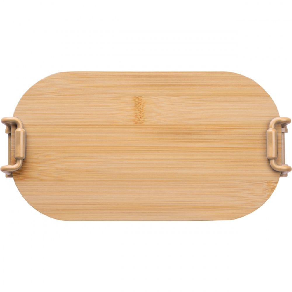 Pudełko na lunch, o pojemności 750 ml, z bambusową pokrywką i metalowymi zaciskami, zamykającymi pudełko.