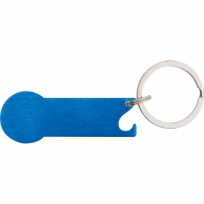 Metalowy brelok do kluczy z żetonem do wózka sklepowego i otwieraczem.