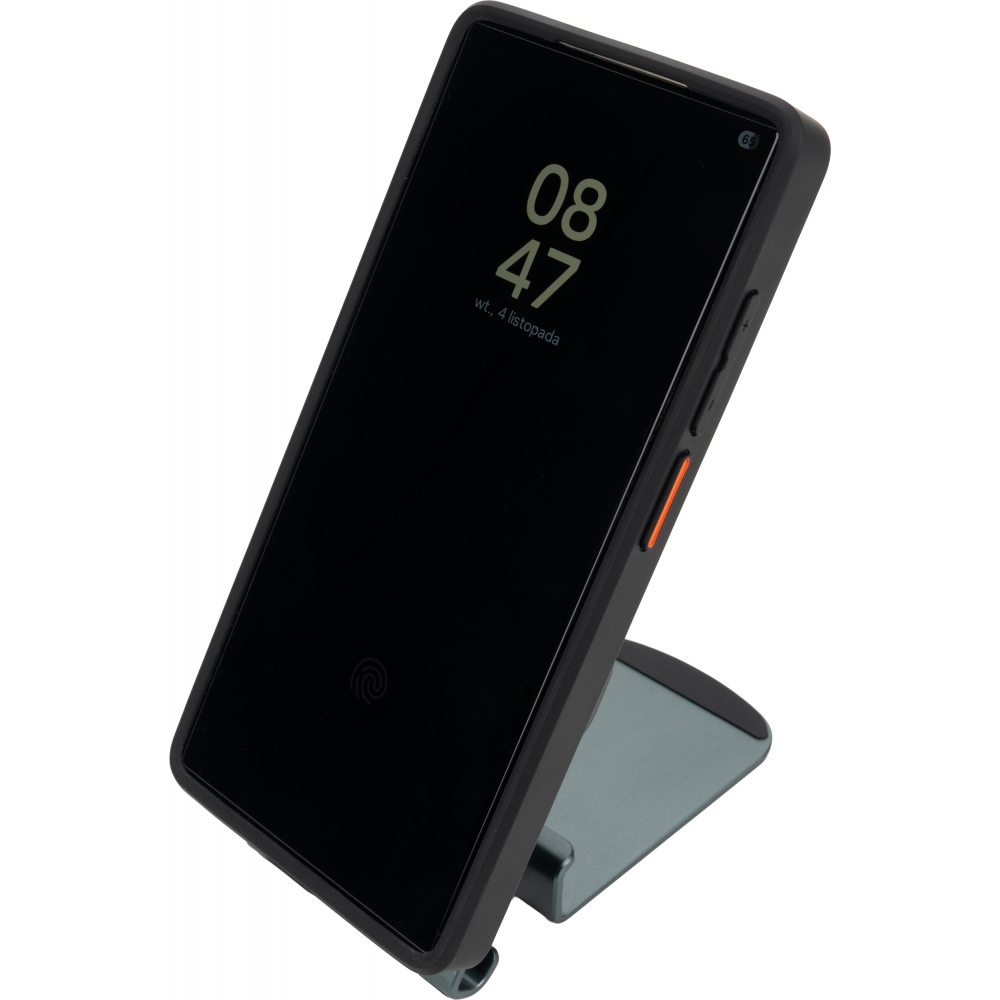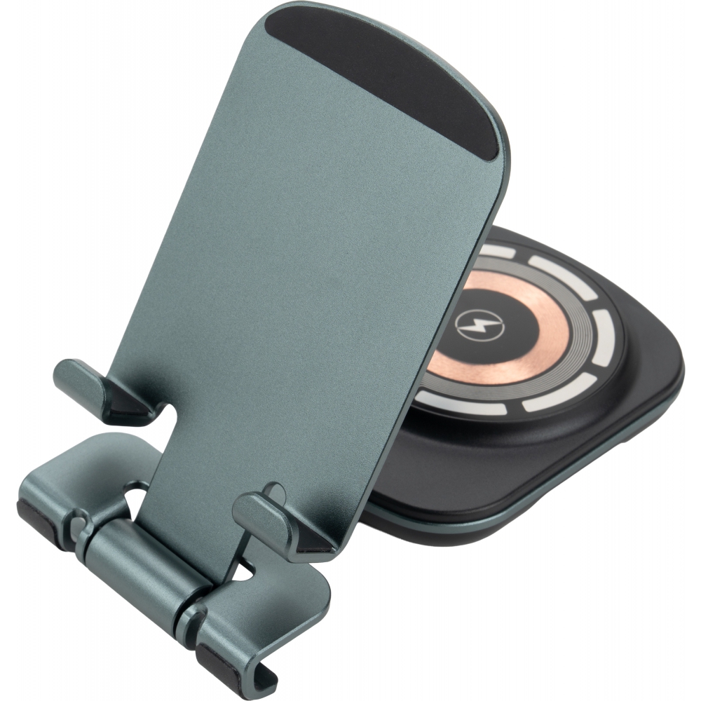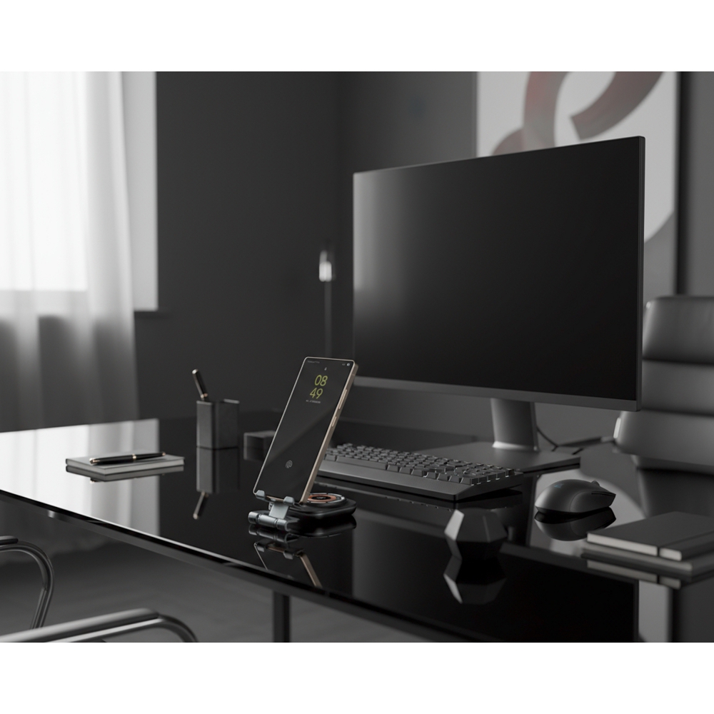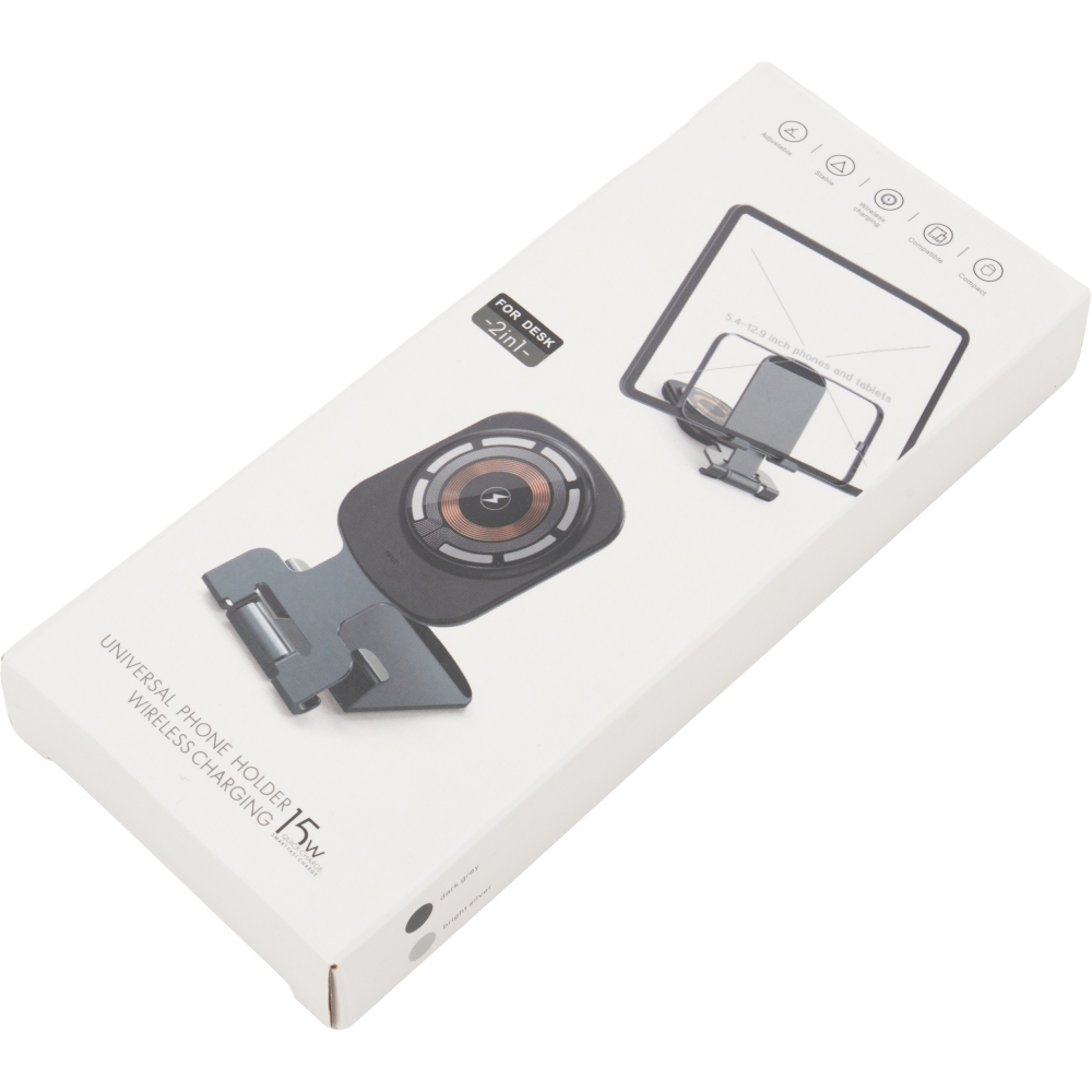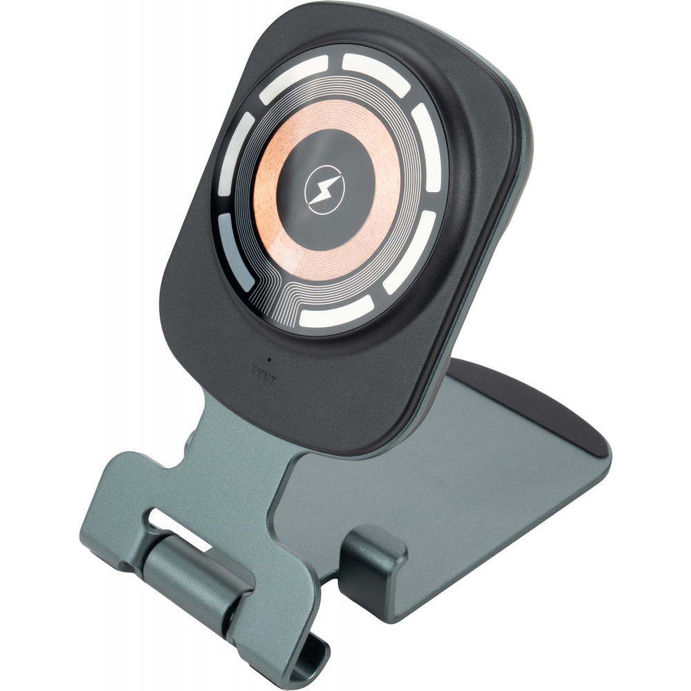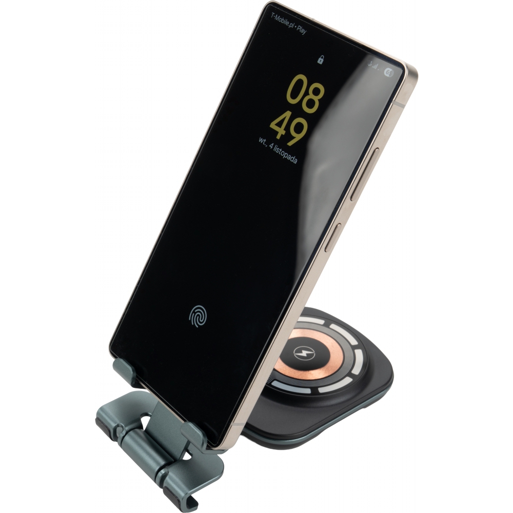 Uniwersalna ładowarka bezprzewodowa pełniąca jednocześnie funkcję praktycznego stojaka na telefon. Urządzenie jest kompatybilne z produktami Apple, takimi jak iPhone, AirPods i Apple Watch. Oferuje szeroki zakres mocy wyjściowej (15W, 10W, 7,5W, 5W), dostosowując się do potrzeb ładowanego sprzętu, a zasilana jest przez nowoczesny interfejs Type-C (wejście: 5V/9V/12V – 2A maks.).