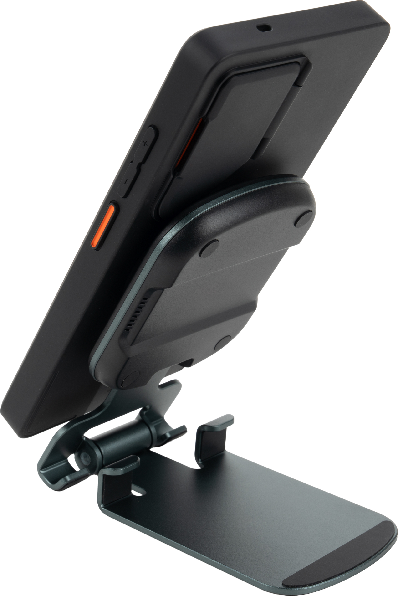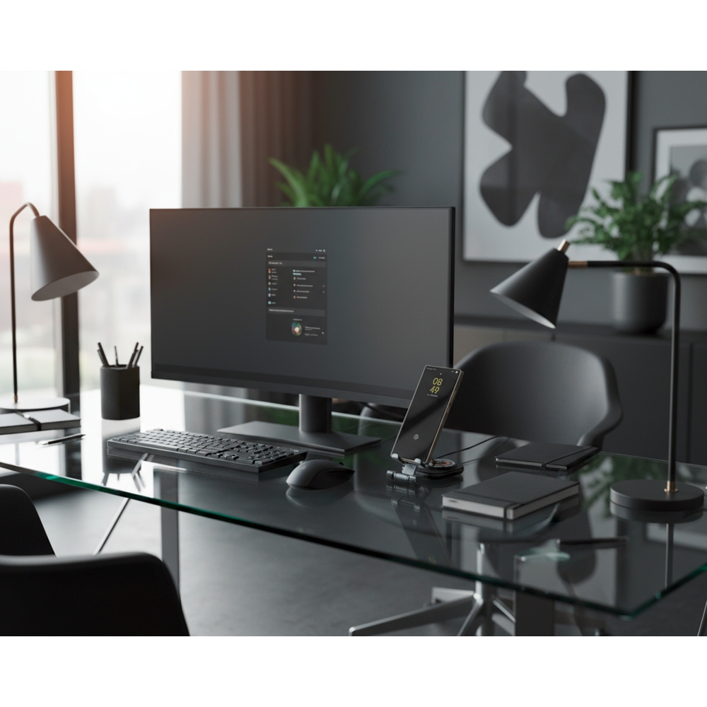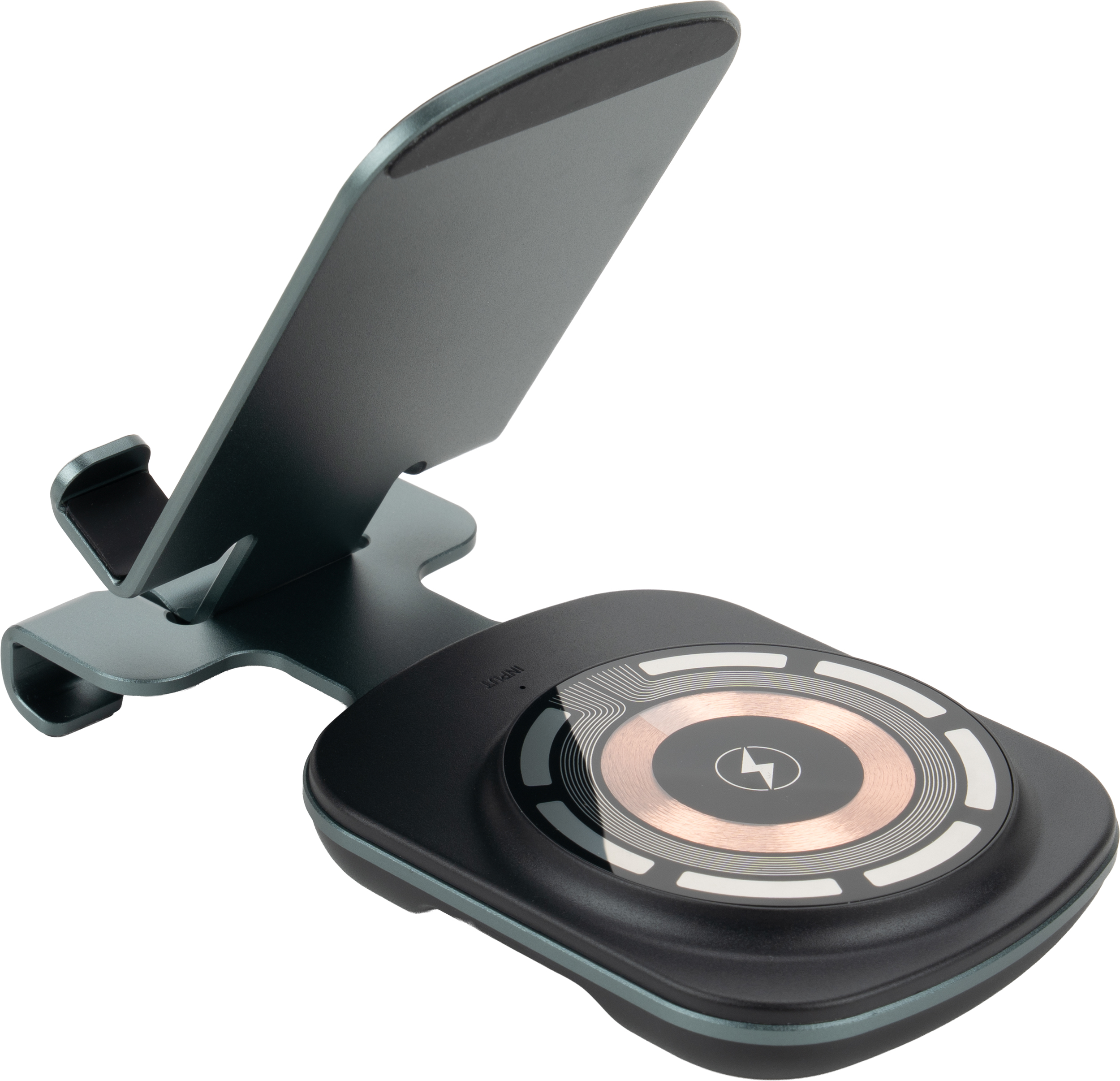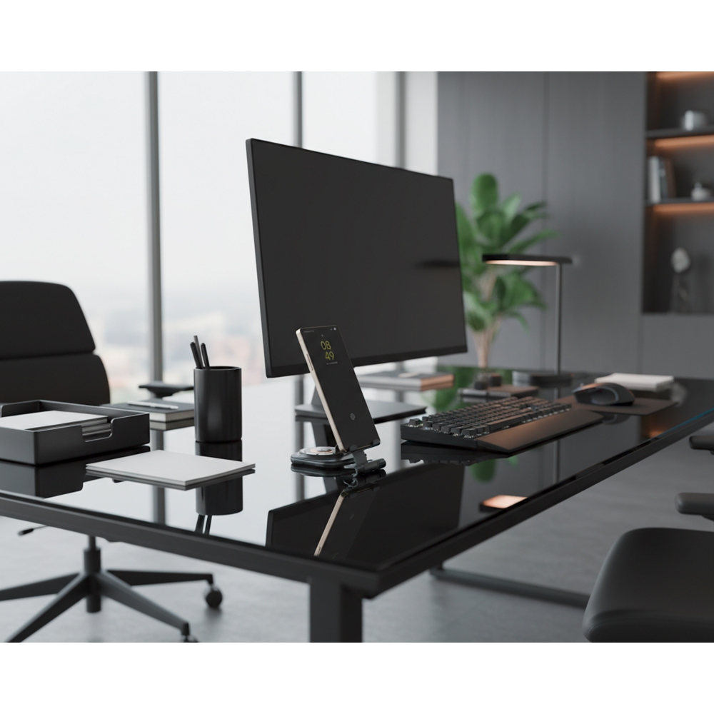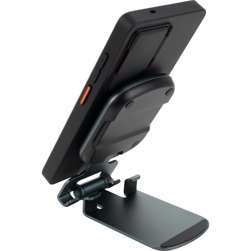 Uniwersalna ładowarka bezprzewodowa pełniąca jednocześnie funkcję praktycznego stojaka na telefon. Urządzenie jest kompatybilne z produktami Apple, takimi jak iPhone, AirPods i Apple Watch. Oferuje szeroki zakres mocy wyjściowej (15W, 10W, 7,5W, 5W), dostosowując się do potrzeb ładowanego sprzętu, a zasilana jest przez nowoczesny interfejs Type-C (wejście: 5V/9V/12V – 2A maks.).
