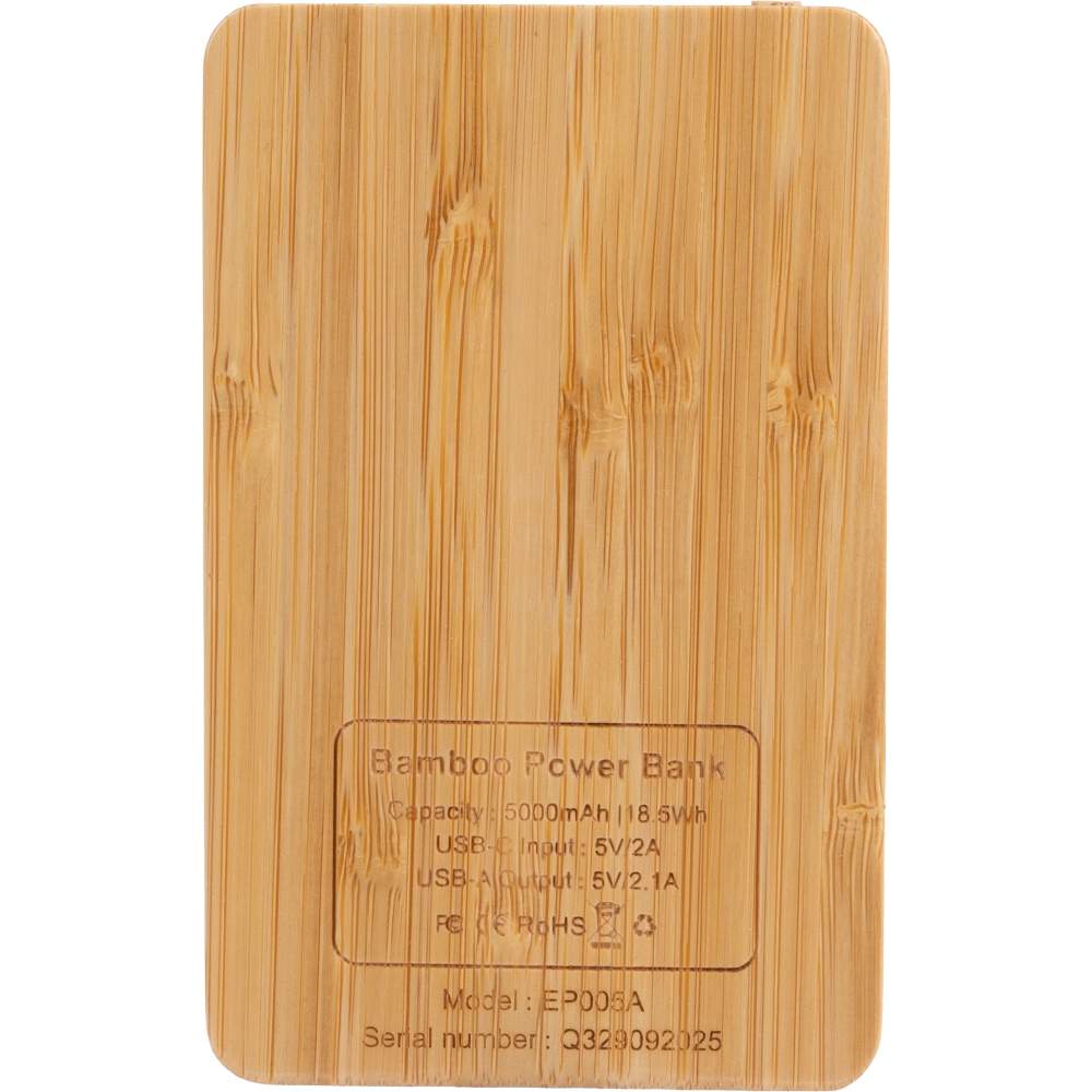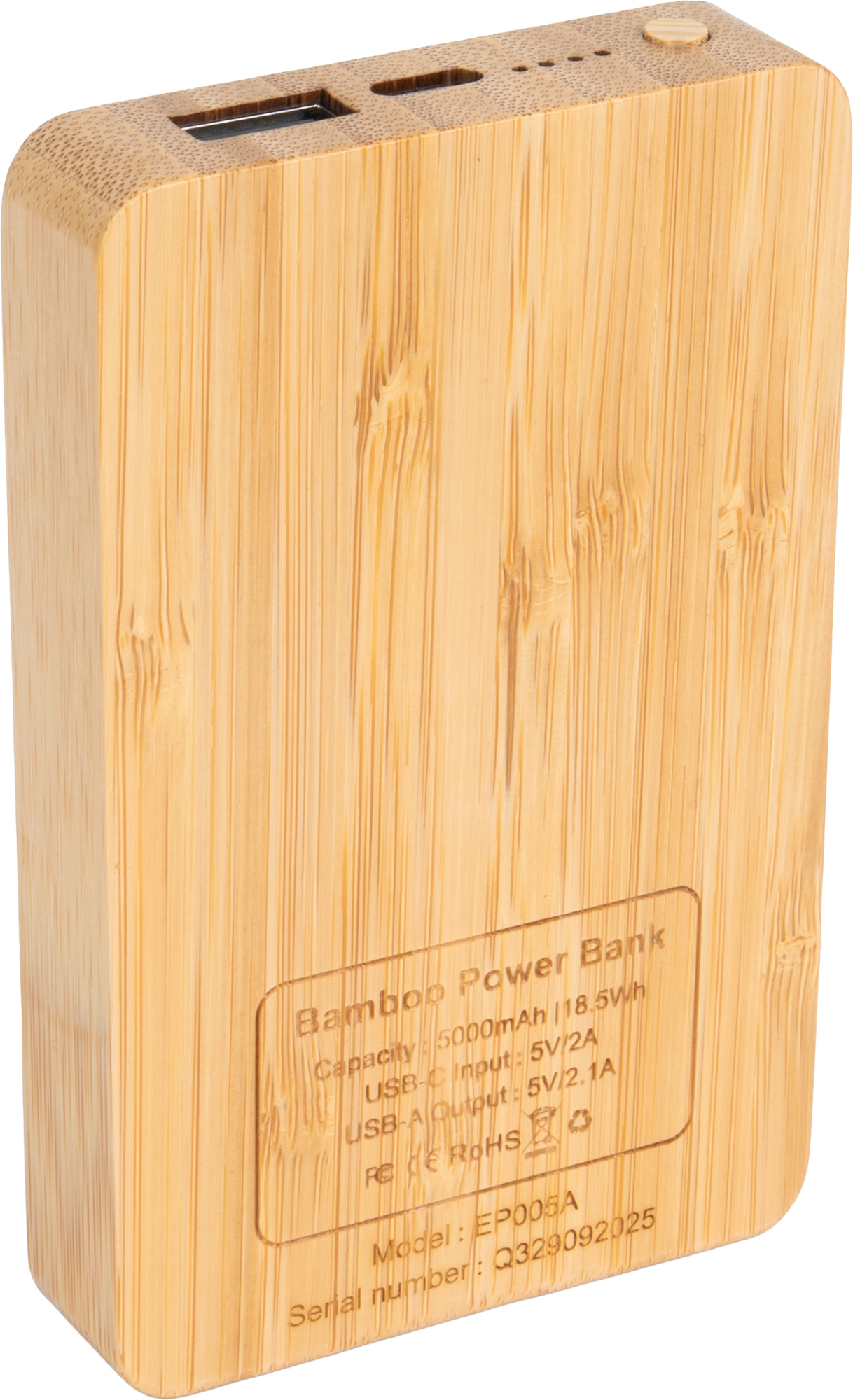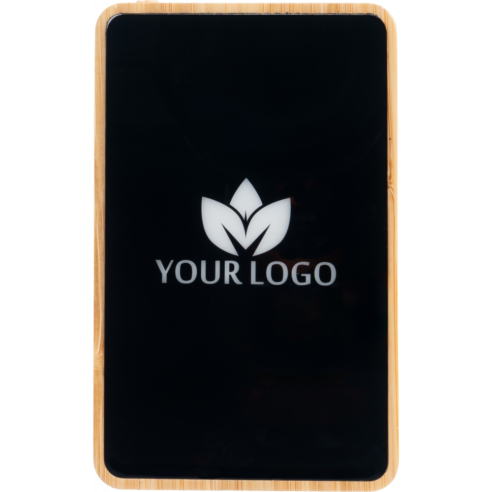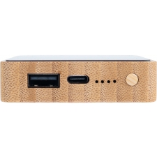 Bambusowy power bank o pojemności 5000 mAh łączy naturalny design z nowoczesną technologią. Grawerowane logo po włączeniu urządzenia elegancko się podświetla, tworząc efektowny akcent wizualny. Cztery diody LED na obudowie informują o aktualnym poziomie naładowania, a port USB-C (wejście/wyjście 5V/2A) oraz klasyczny port USB (5V/2A) zapewniają szybkie i niezawodne ładowanie. W zestawie znajduje się kabel USB-C, dzięki czemu power bank jest gotowy do użycia od razu po wyjęciu z pudełka.