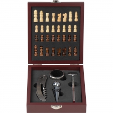 Zestaw do wina w drewnianym pudełku z dołączonymi drewnianymi szachami. W pudełku znajdują się: nóż kelnerski, korek, termometr i ociekacz.