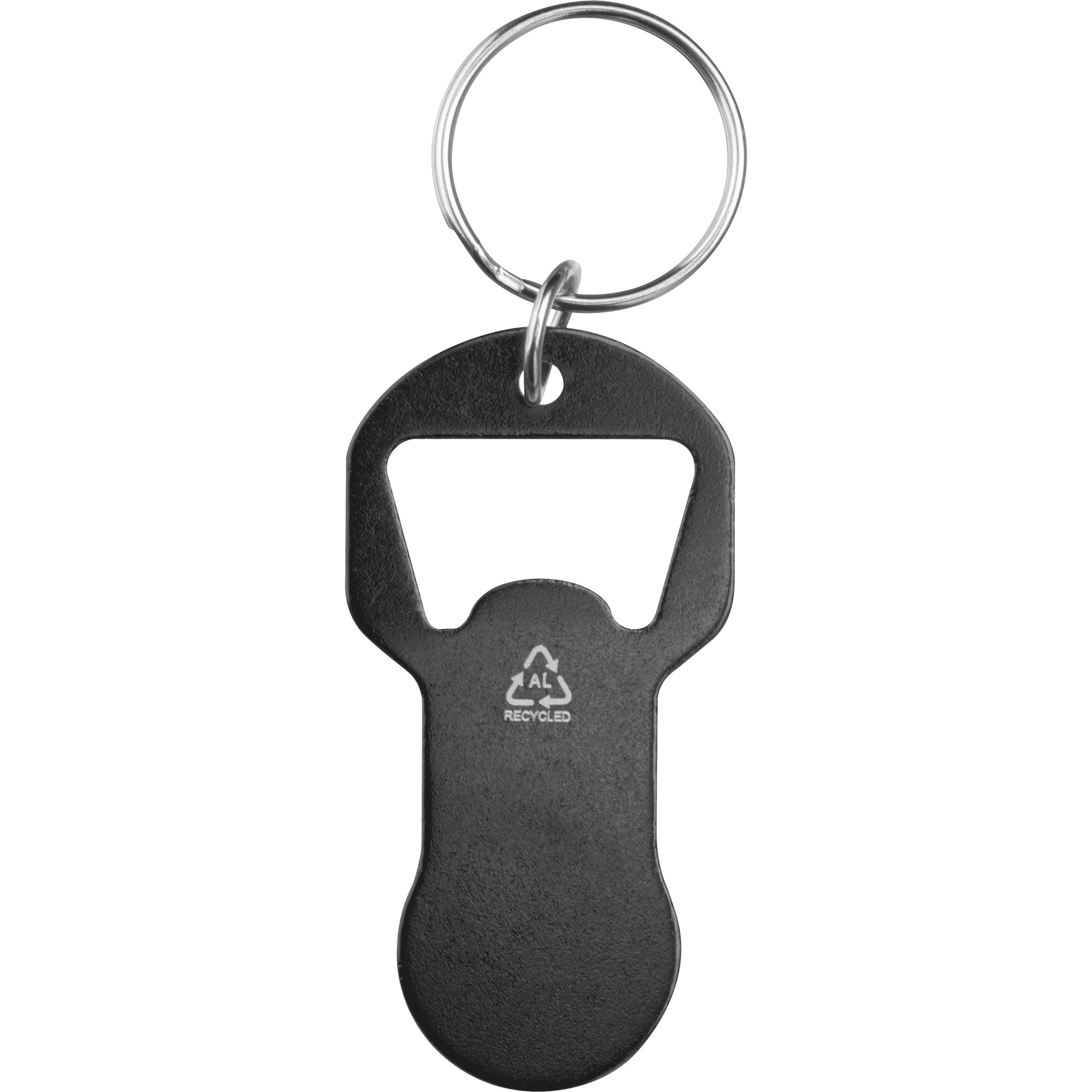 Brelok do kluczy wykonany z aluminium z recyklingu, wyposażony w otwieracz do butelek oraz żeton do wózka sklepowego. Lekki, praktyczny i doskonały do codziennego użytku.