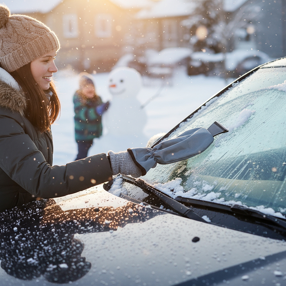 Plastikowa skrobaczka do szyb z rękawicą, która na zewnątrz została wykonana z wytrzymałego poliestru (600D), a w środku z ciepłego polaru.