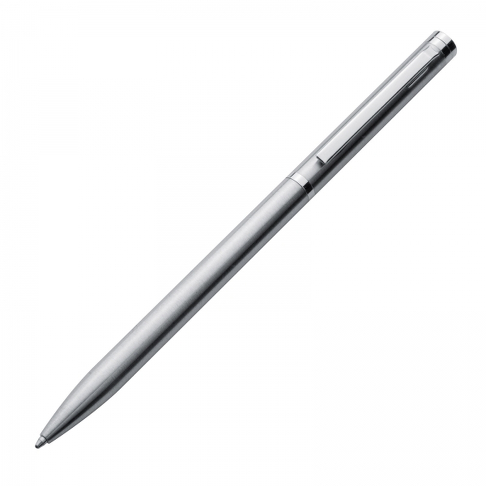 Metalowy długopis z chromowanym klipsem i wkładem piszącym na niebiesko.