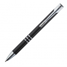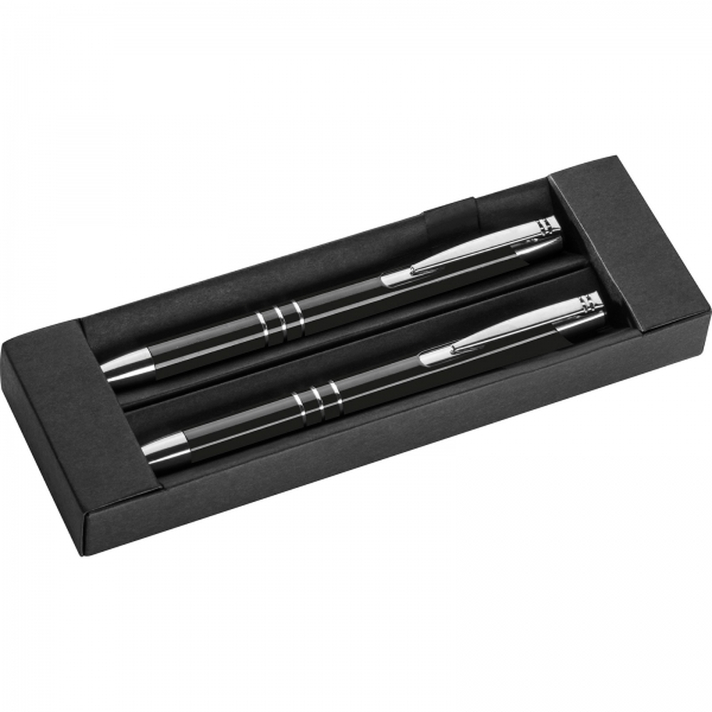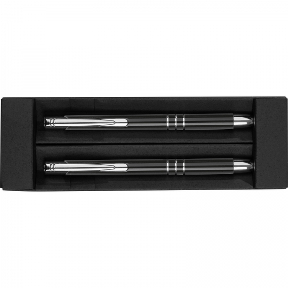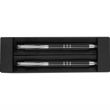 Metalowy zestaw piśmienny składający się z długopisu z niebieskim wkładem oraz ołówka automatycznego. Całość umieszczona w etui.