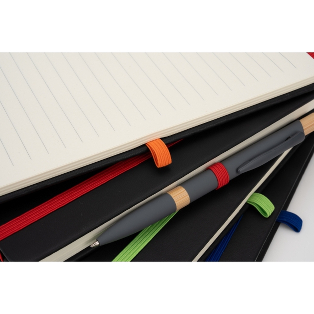 Notes o formacie A5, z okładką wykonaną z PU. Posiada 192 stron w linię, o gramaturze 70 g/m2. Notes ma również zakładkę i gumkę do zamykania. Grawer odsłania kolor okładki.