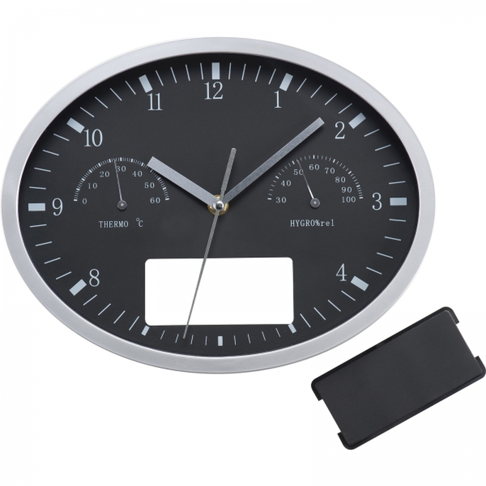 Owalny zegar ścienny z termometrem i higrometrem. Logotyp można umieścić na specjalnym panelu.